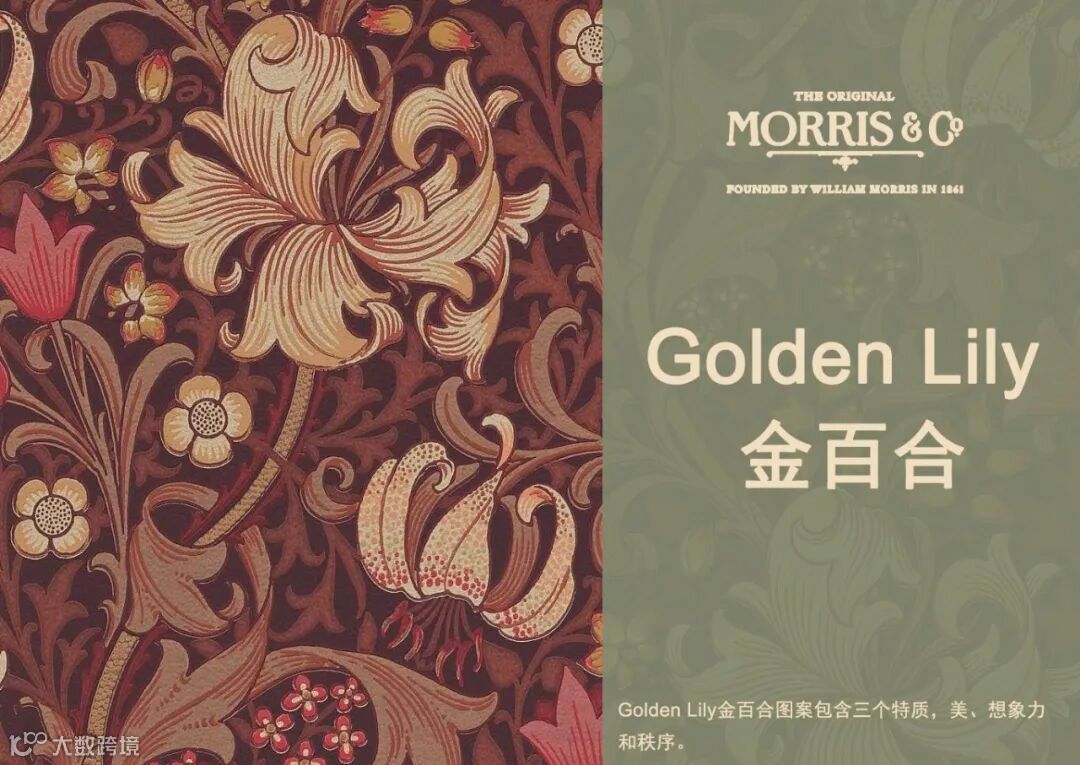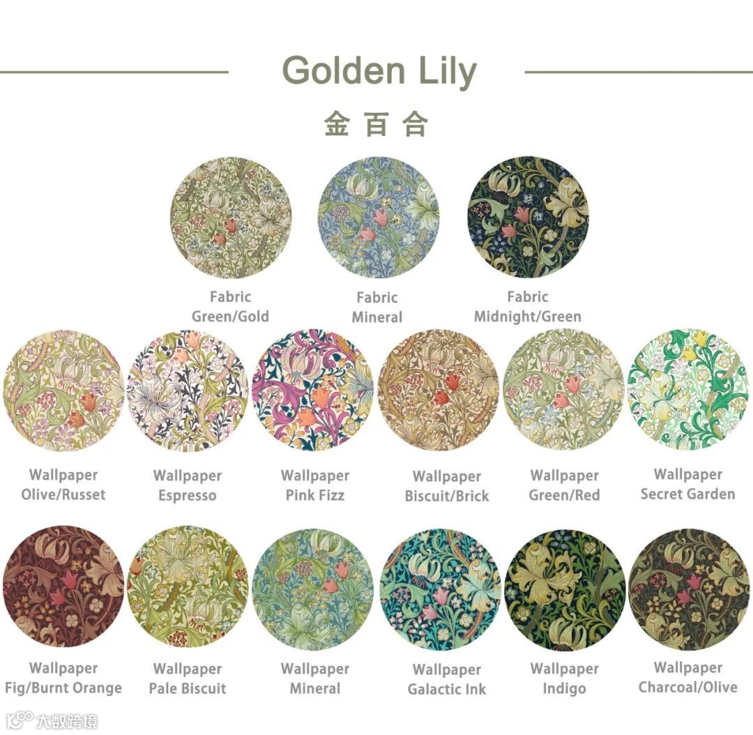 迪尔(J.H. Dearle)的《金百合》(1899)强有力的对角线排列带来了缠绕的百合茎和卷须结构。作为莫里斯公司最伟大的遗产和最经久不衰的流行设计之一,金百合在这里有两种引人注目的配色。