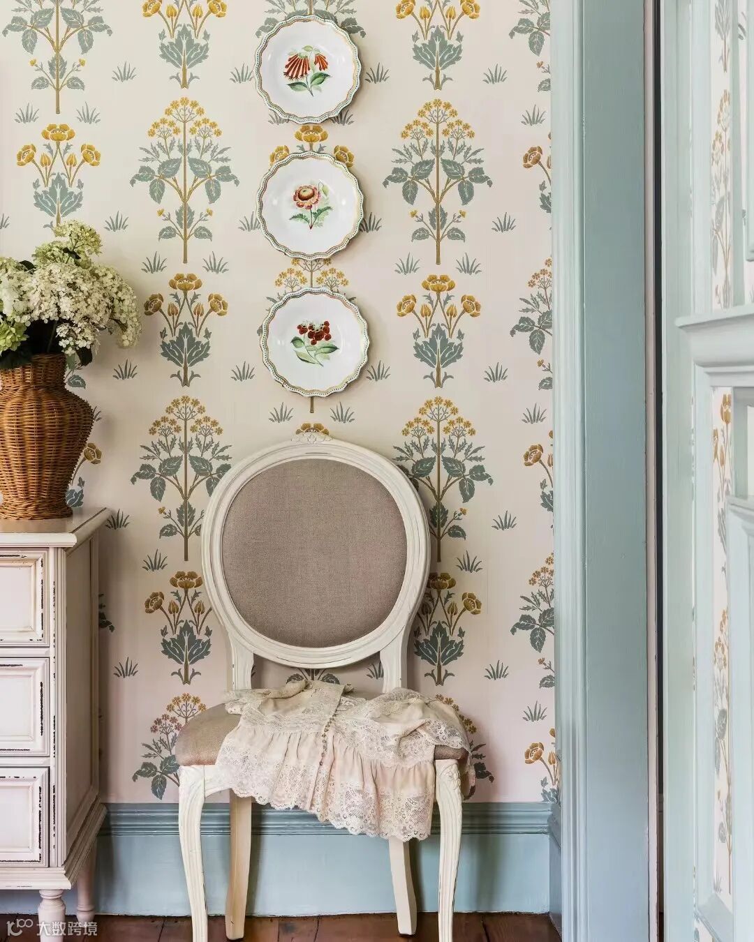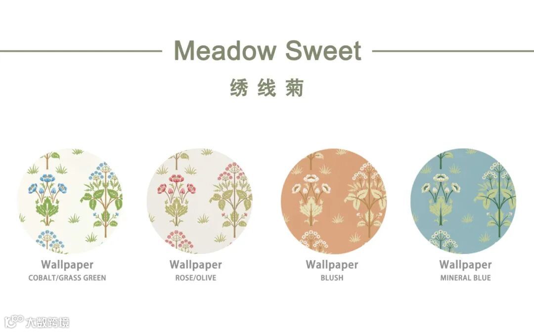 Meadow Sweet 绣线菊图案异想天开,充满怀旧的魅力,对称的植物图案被排列在一个正式的设计上穿过这张壁纸,典型的工艺美术风格。这种壁纸最初是由J.H. Dearle于1904年设计的,它的颜色轻盈、通透,但真正引人注目的是色彩丰富的腮红和矿物蓝色调。