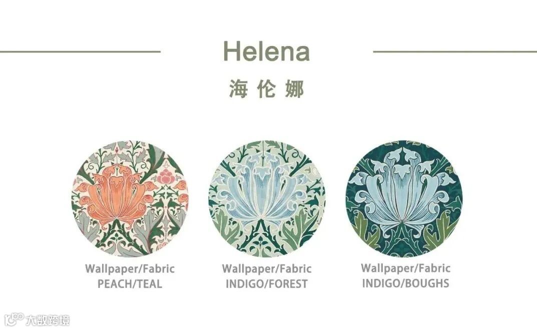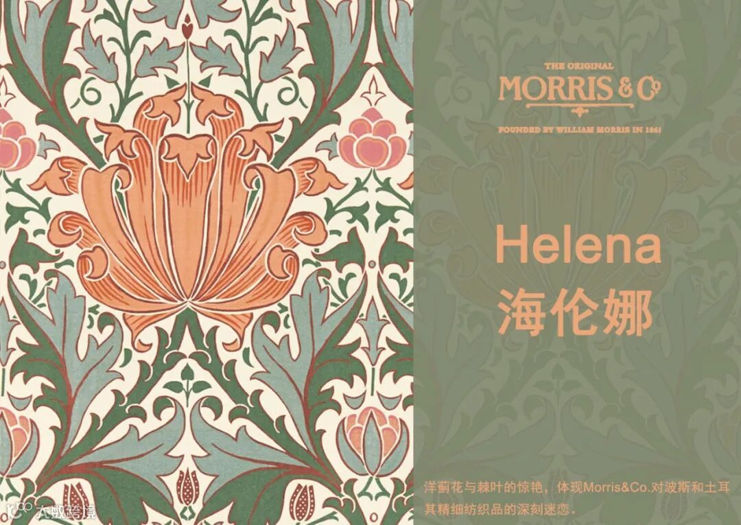 j·H·迪尔(J. H . Dearle)对海伦娜(Helena)的设想是在1891年设计的织物提花面料,反映了他对波斯和土耳其精细纺织品的深刻迷恋,在他作为设计师的巅峰时期,这些纺织品一直吸引着他的目光。错综复杂的图案无缝地将洋蓟花与棘叶和贝母的背景融合在一起。在Morris & Friends系列中,海伦娜取代了它的位置,在传统色调中获得了当之无愧的认可。