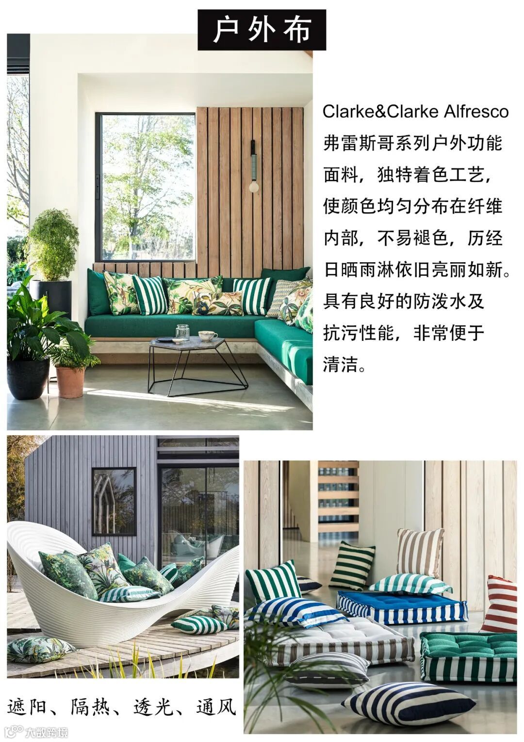 对于Clarke&Clarke来说,“Alfresco”户外布系列是令人兴奋的第一款迷人的室内/室外面料新系列。这十一款引人注目的设计图案非常适合户外沙发、单椅套、靠垫和百叶窗,包括大胆的特色印花、V字形、溶液染色图案、条纹和互补的素色布。Alfresco户外布系列具有抗菌、防晒和防污的特性,在一系列精致、温暖的颜色和清新的海岸色调中,给人一种充满活力的热带雨林风感觉。当科技愈发达,自然便逐渐成为社会的稀缺元素。许多人开始追求一个充满生命力、灵动、贴近自然的空间。