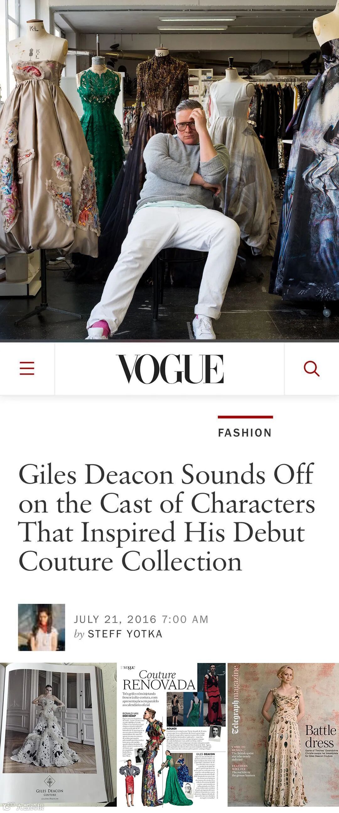Giles Deacon 贾尔斯 迪肯曾出任意大利品牌宝缇嘉(Bottega Veneta) 的首席设计师,并为之注入新的时尚元素,成功地吸引了众多时尚媒体的关注。2002年2月,他推出个人品牌系列贾尔斯·迪肯 (Giles Deacon),备受关注。从此,贾尔斯·迪肯 (Giles Deacon) 品牌便成为伦敦时装周最瞩目的招牌秀之一。Giles Deacon 贾尔斯 迪肯还为很多国际搭配设计过时尚礼服,比如范冰冰、戚薇等。贾尔斯·迪肯 (Giles Deacon) 还是个出色的时装插画家,他的作品多次登上各大时尚杂志,这一点也可以在他众多以印花取胜的设计作品中体现。