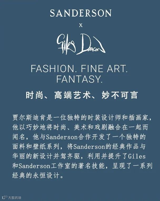 设计师贾尔斯·迪肯(GilesDeacon)说伦敦这个奇妙的城市极度热爱:"这儿还有好多尚待发掘新鲜玩意呢!"这个跟Sanderson合作的新品系列运用了他经典迷幻印花系列,搭配嫩粉色、驼黄色、红色、绿松石色层出不穷、艳丽迷人的色调,致力发扬他心目中正统的英伦精神。