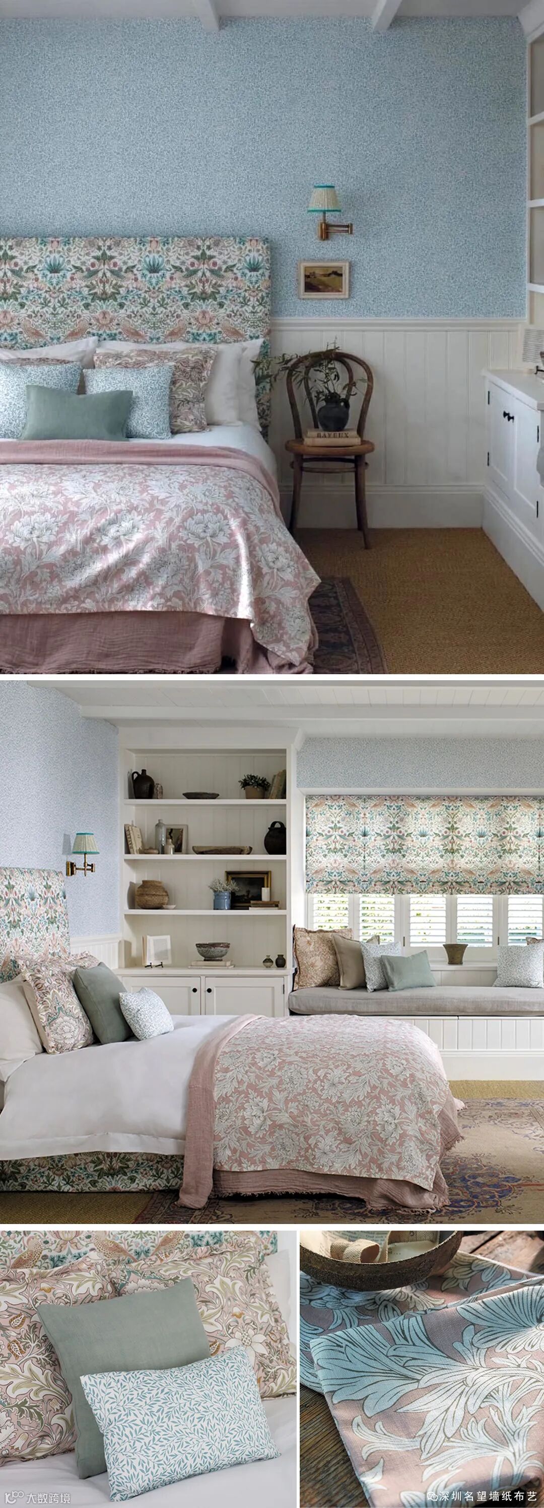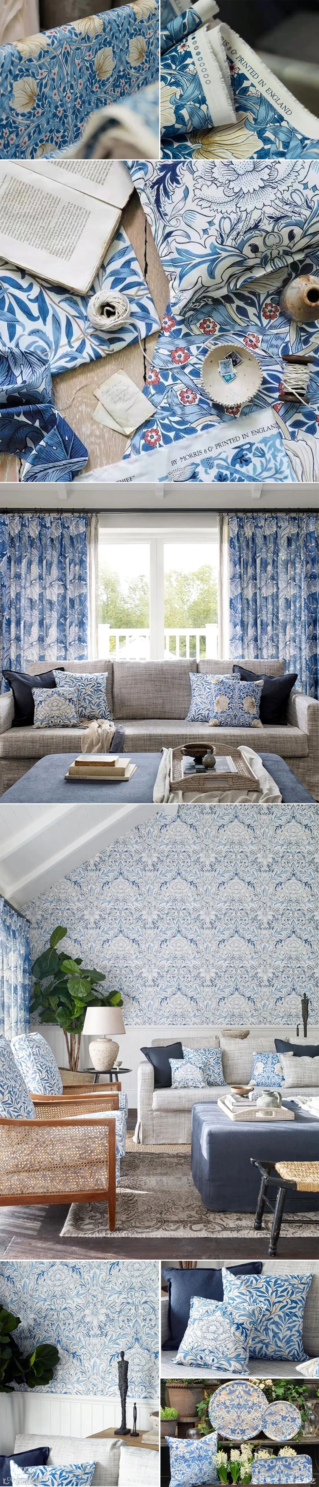 深圳名望墙纸布艺将Morris&Co.经典标志性图案搭配高纯度的色彩,融入家居设计里,简约、自然、大气,足以打动人心,利用软装营造随心写意的家居氛围,实用的功能,精细的工艺,带出质感的生活,酿造温暖家庭的味道。