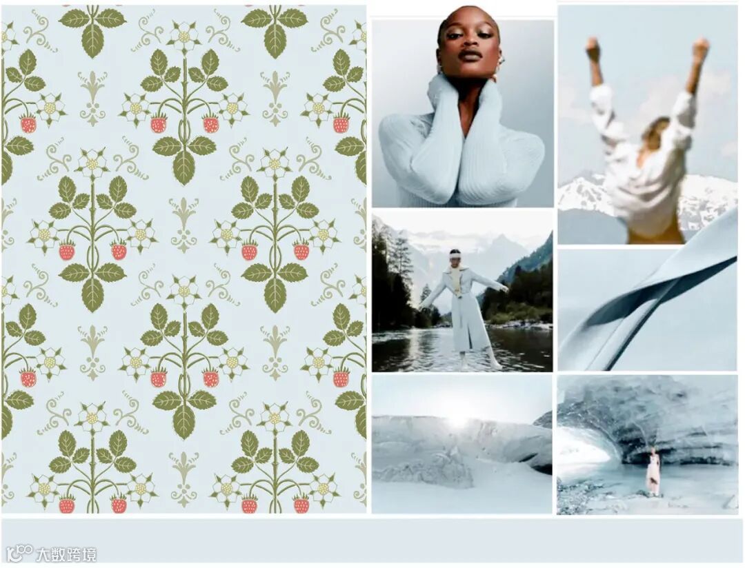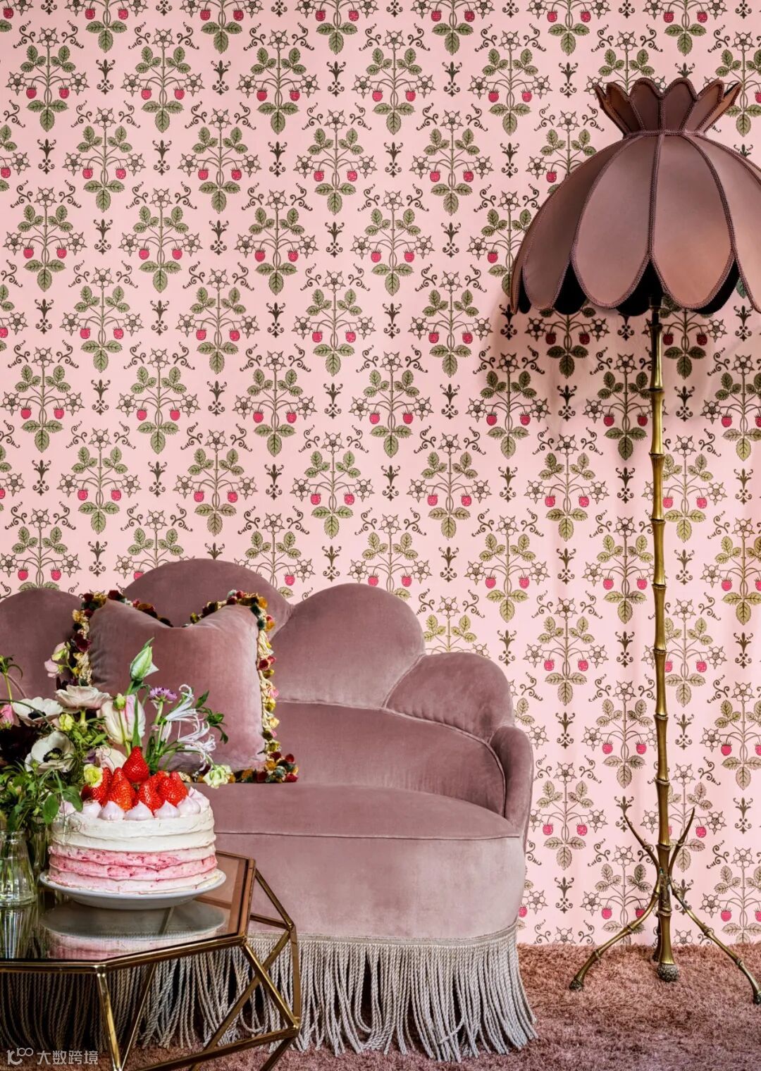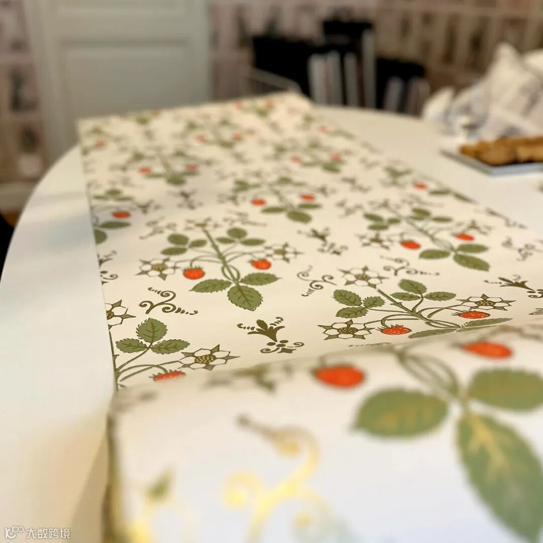 “草莓”图案以其均匀的印刷呈现出精致的草莓果实与花朵的有机几何形态。这一设计最初源自19世纪40年代的手工木版印刷,如今以柔和的色调重新演绎,凸显了贯穿其中的田园风情元素。