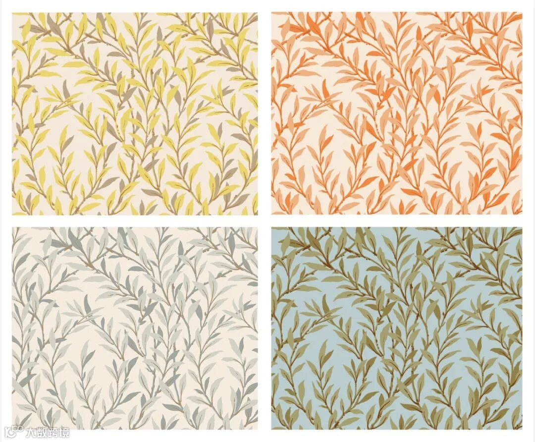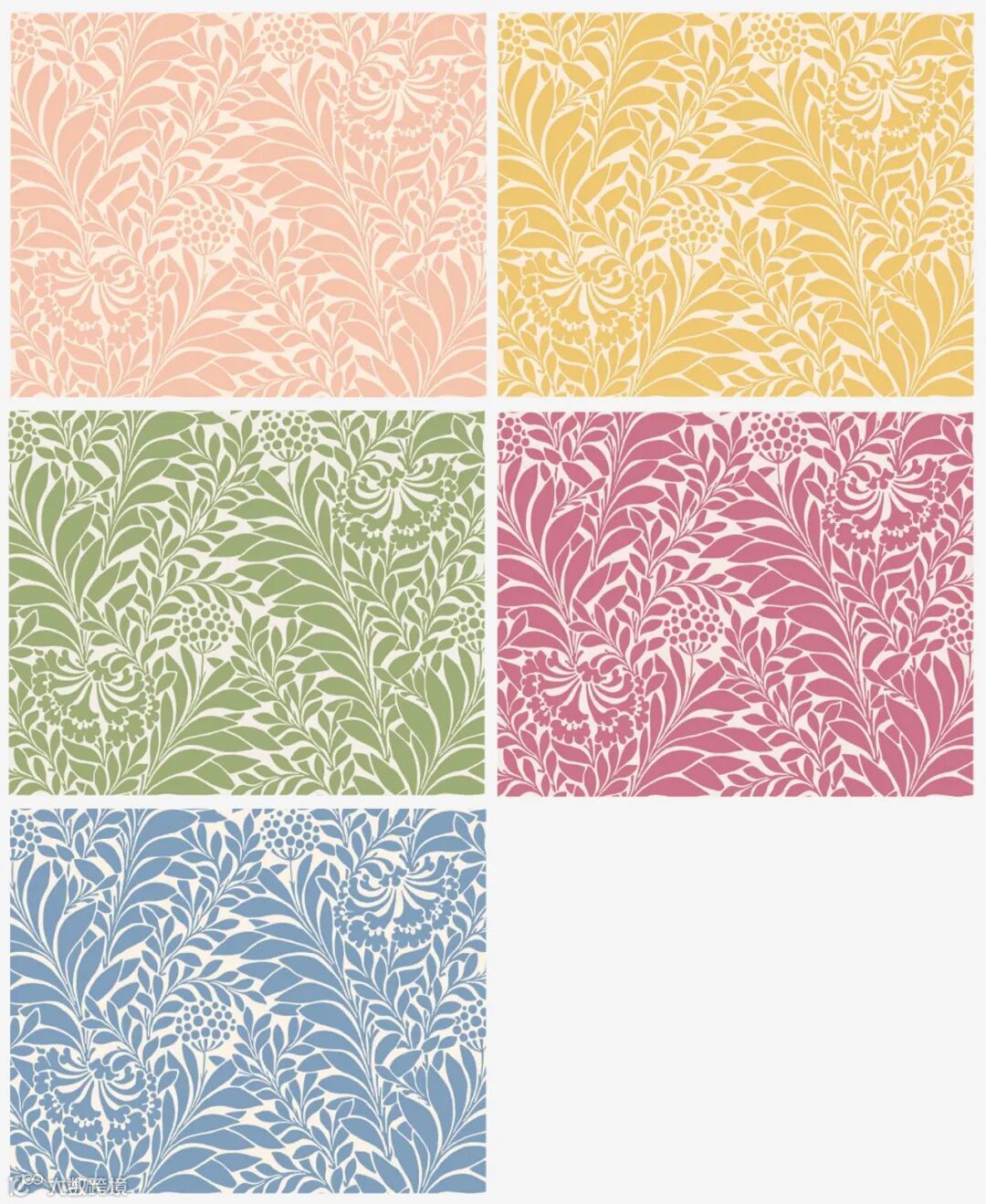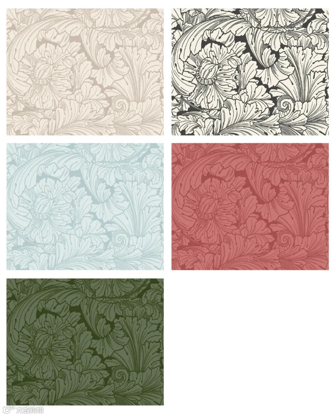 “茛苕”图案以其精致的线条描绘出风格化的花丝状花朵与枝叶,使这一源自艺术与工艺运动的档案设计既经典又现代。这种多年生植物的大叶片为这一植物图案增添了奢华感,其配色庄重而典雅,包括柔和的卵石灰、印刷室蓝,以及大地的森林绿,还有引人注目的单色烟灰、雪白与红色,共同构成了丰富的视觉层次。