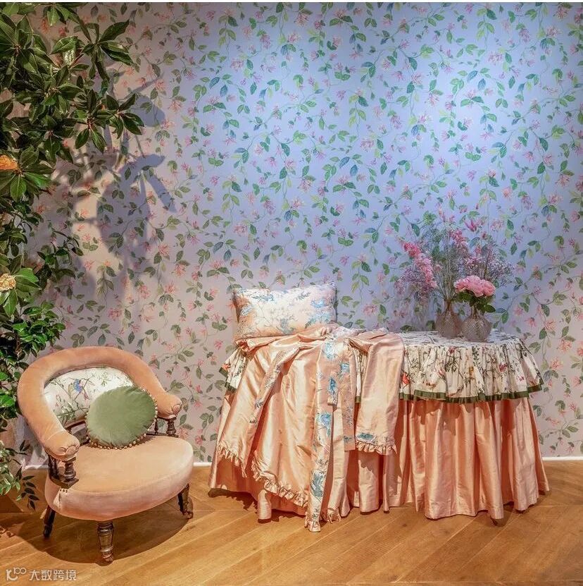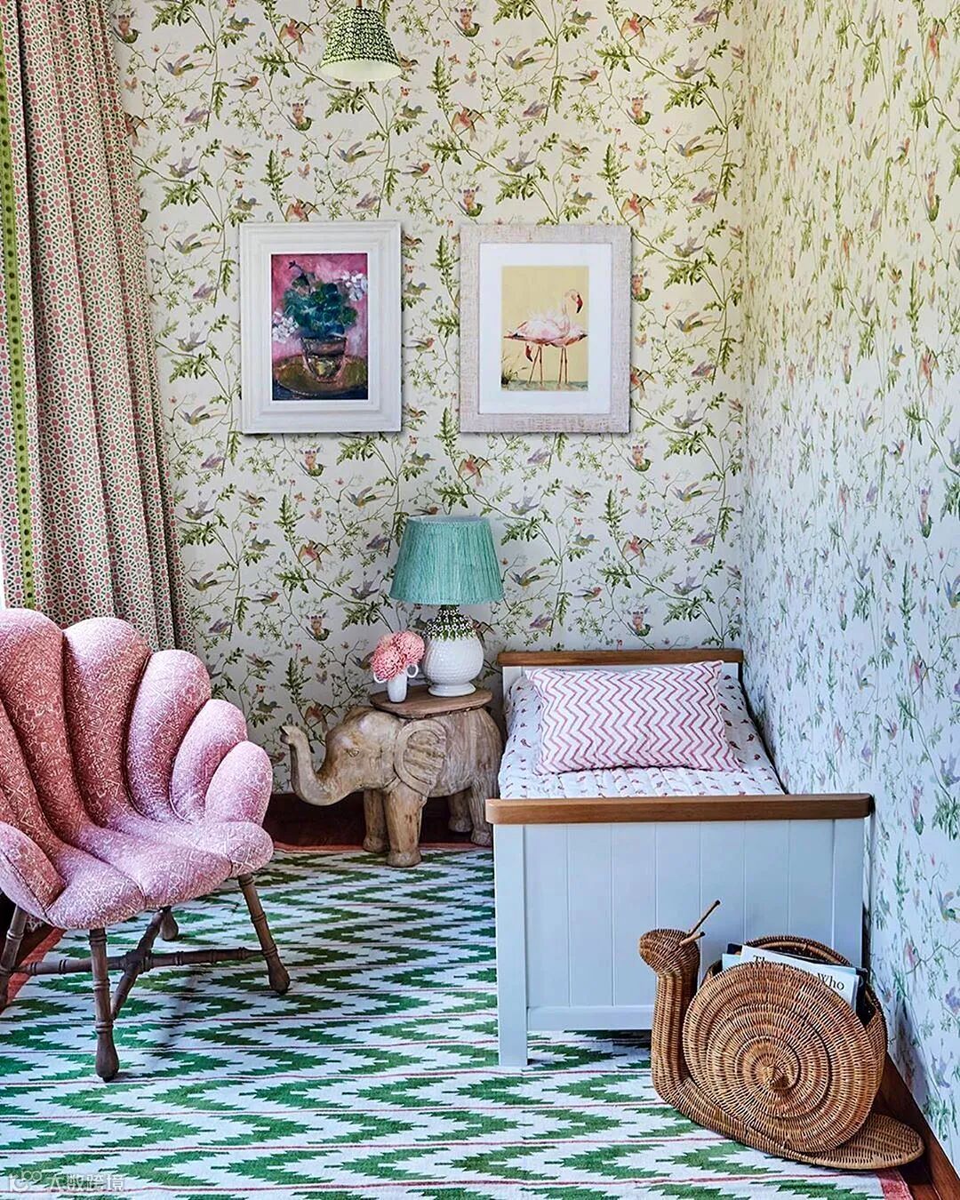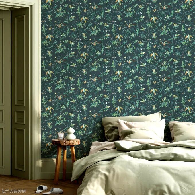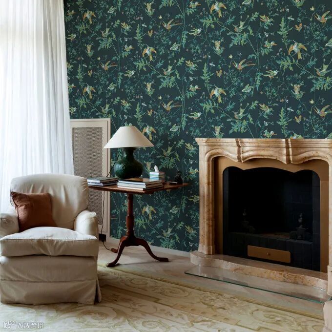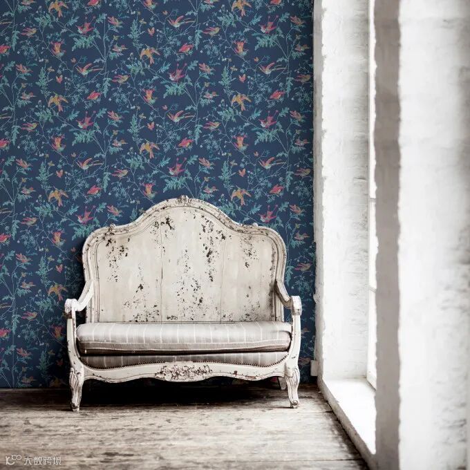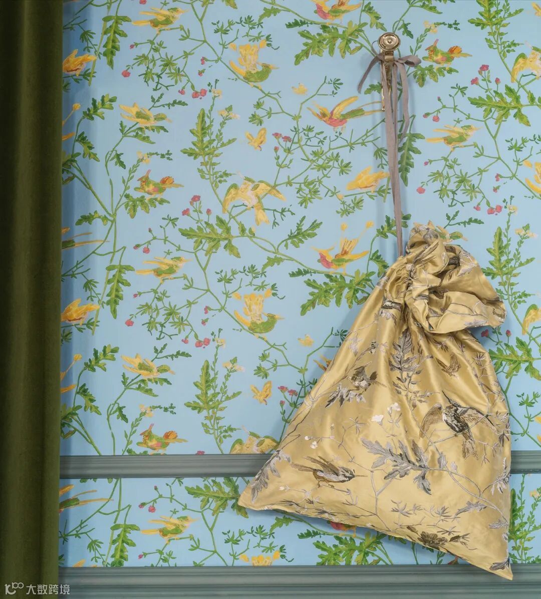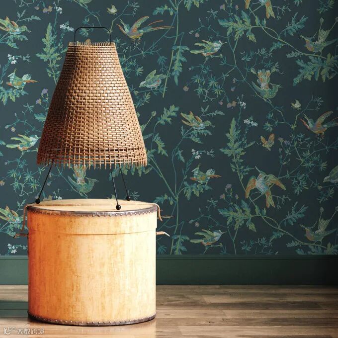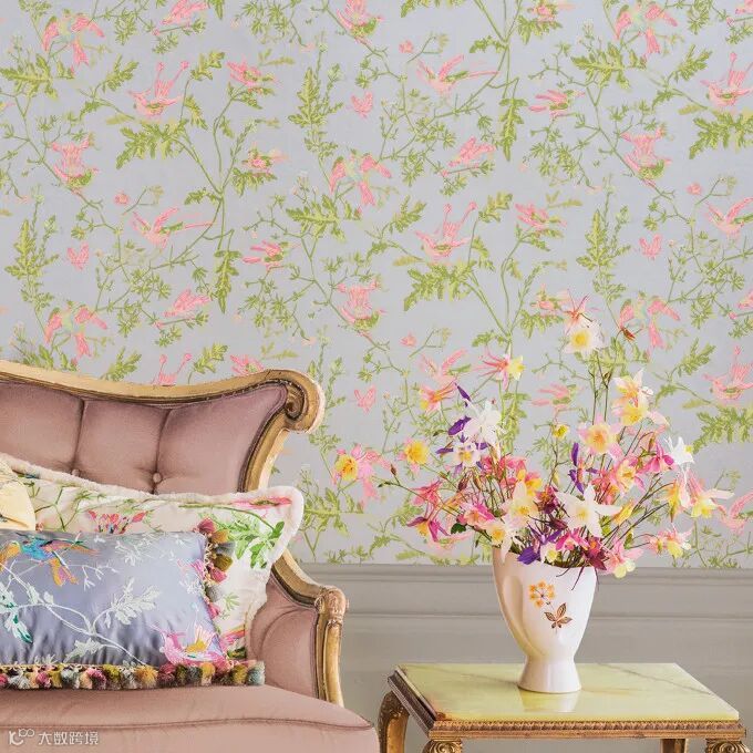 Cole&Son的Hummingbirds Flora系列对飞行中的蜂鸟进行了精细研究,描绘了这些体型较小的鸟类在花朵之间飞行收集花蜜的过程。它们栖息在树枝上,周围是郁郁葱葱的金银花和蝴蝶,为这个壁画场景增添了一种奇思妙想。