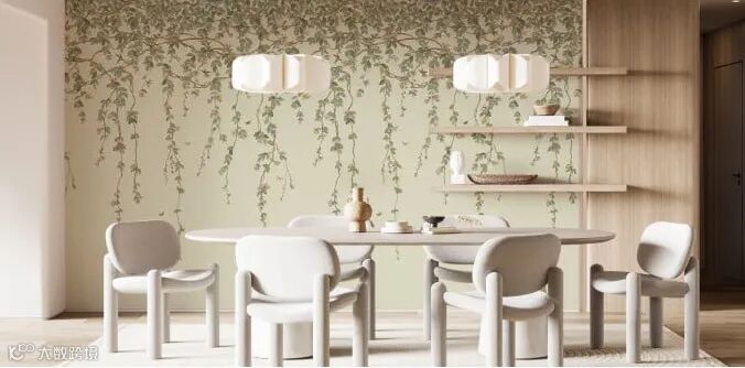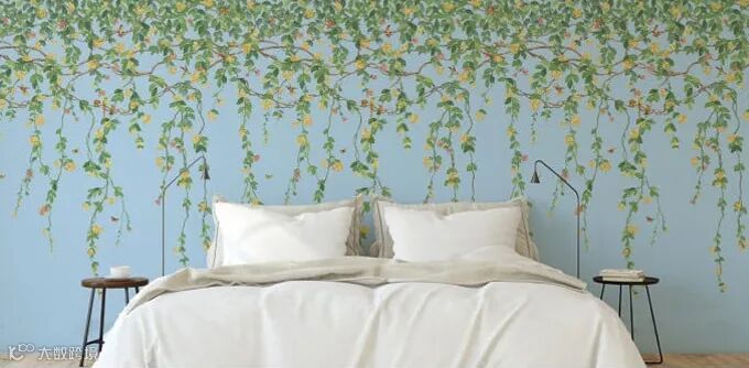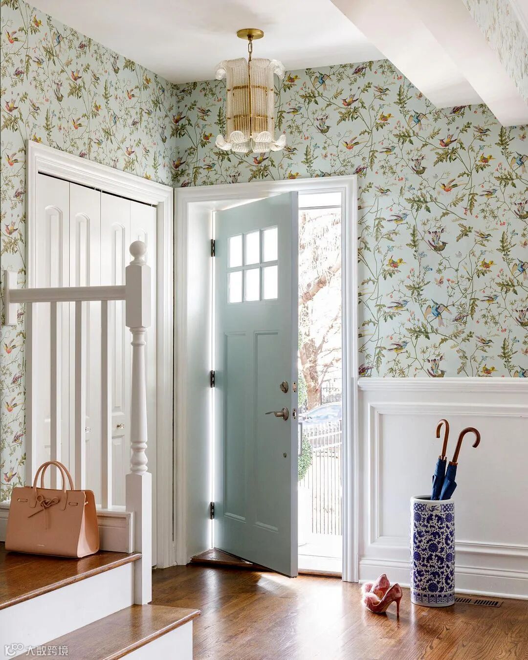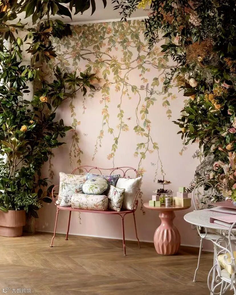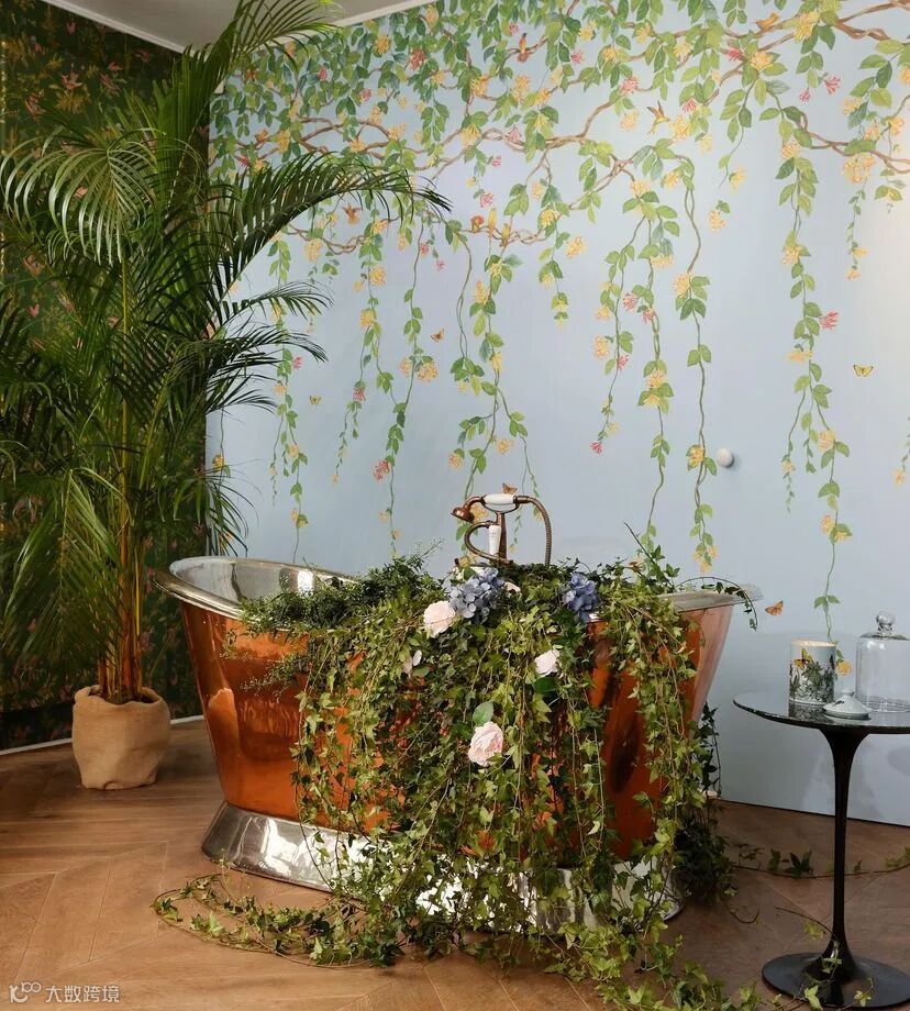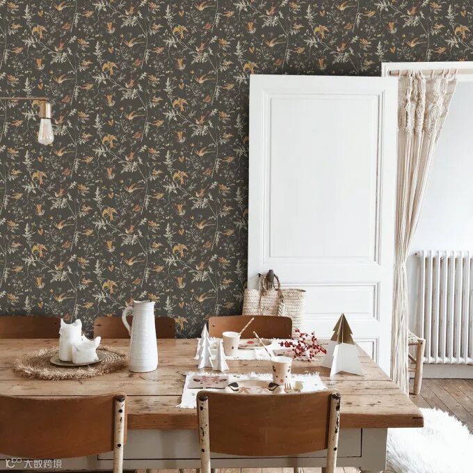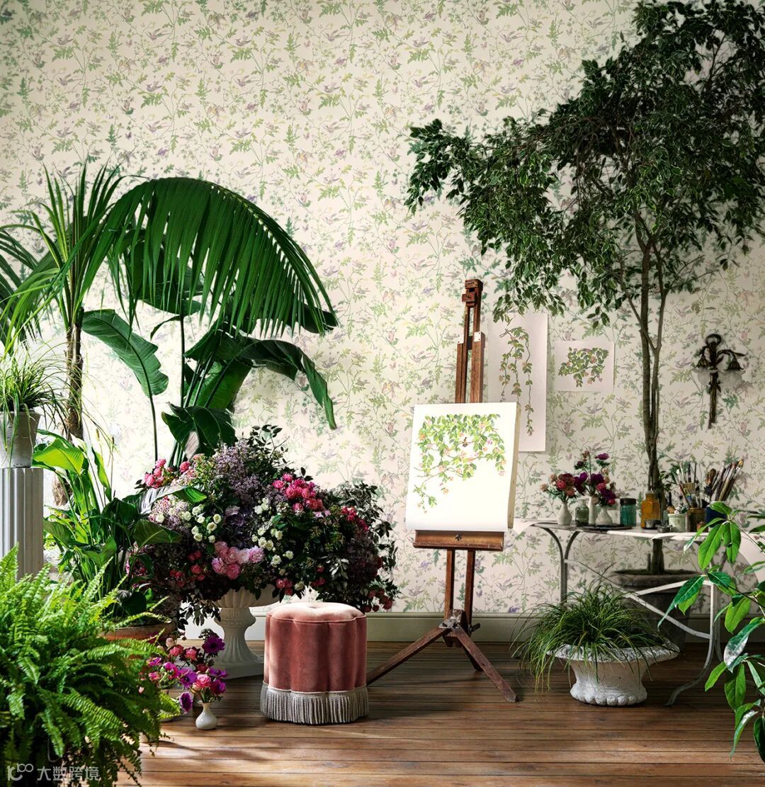 Cole&Son的Hummingbirds Flora系列对飞行中的蜂鸟进行了精细研究,描绘了这些体型较小的鸟类在花朵之间飞行收集花蜜的过程。它们栖息在树枝上,周围是郁郁葱葱的金银花和蝴蝶,为这个壁画场景增添了一种奇思妙想。