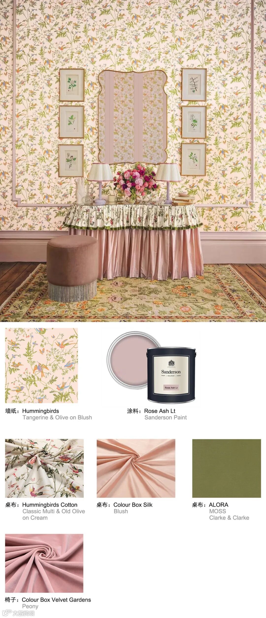 Hummingbirds蜂鸟图案最初创建于18世纪80年代,是一个有18种颜色组成的手工雕版印刷图案,使用一种称为“补丁打印”的方法进行打印,打印机可以在每个压痕上打印多种颜色,蜂鸟一直是Cole&Son公司投资组合中的一颗珍贵宝石。现在,这种晚期格鲁吉亚风格的设计以12种颜色的表面印花印刷,在王室住宅中——尤其是维多利亚女王位于肯辛顿宫的前卧室——以及时装T台上——仍然可以找到,英国时装设计师保罗·史密斯的2002秋冬女装系列中也有这种设计。