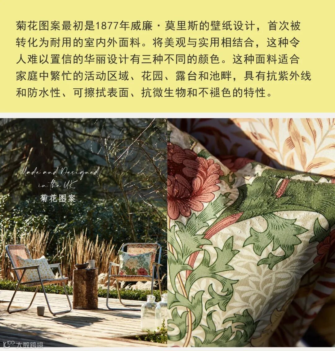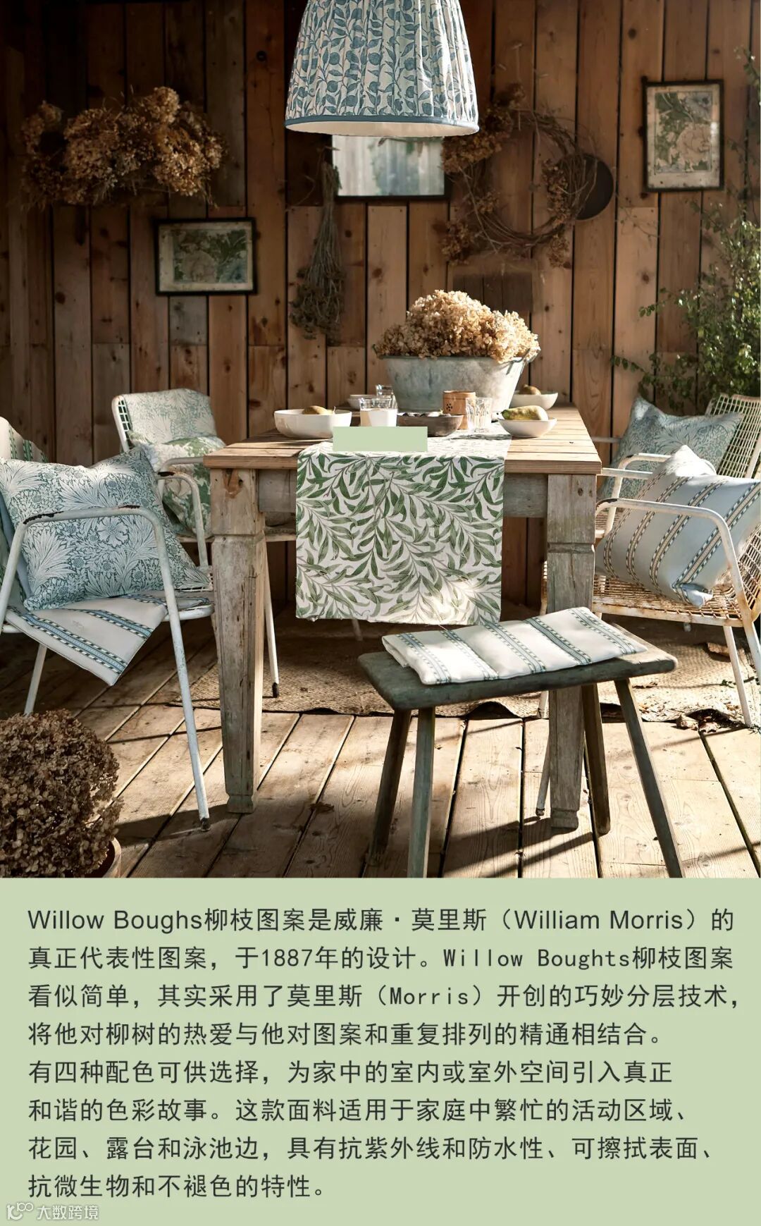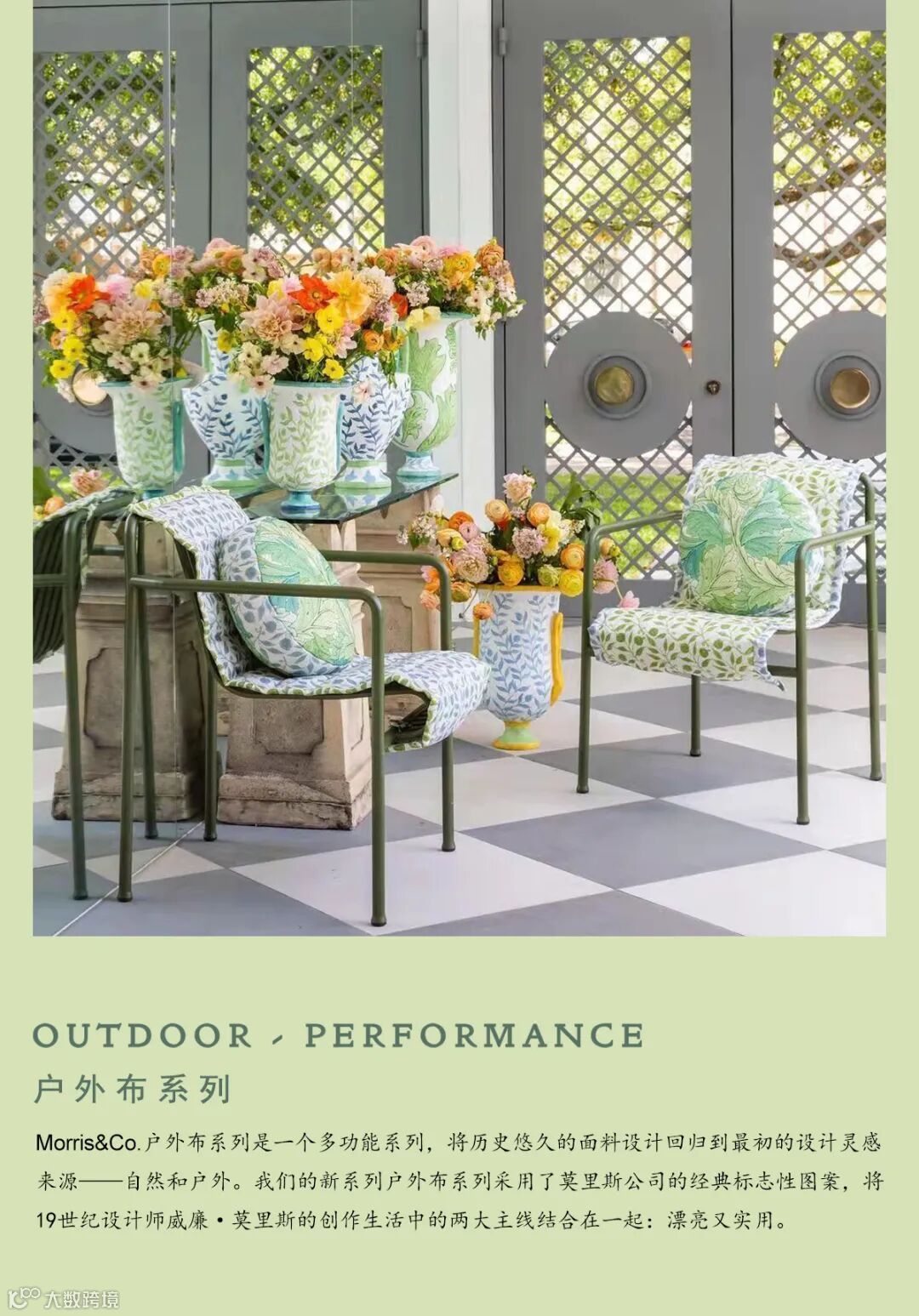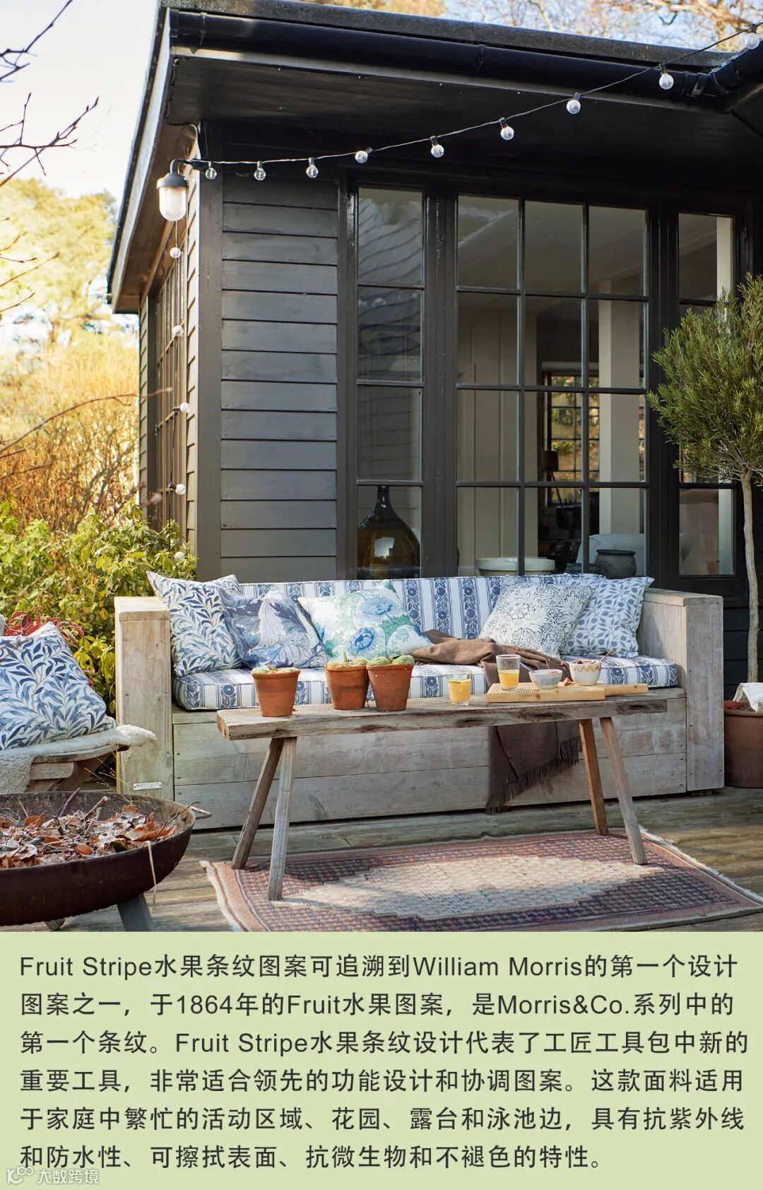Morris&Co.新推出的户外布系列包含了25种经久耐用的面料,非常适合家庭中繁忙的活动区域、花园、露台和泳池边。我们英国工厂一支专门的制造商团队使用创新的材料和技术生产,确保室内和室外使用的耐用性。这些 特殊处理包括抗紫外线和防水性、可擦拭整理、抗微生物和不褪色性能,为您的面料应对日常生活的喧嚣做好准备。