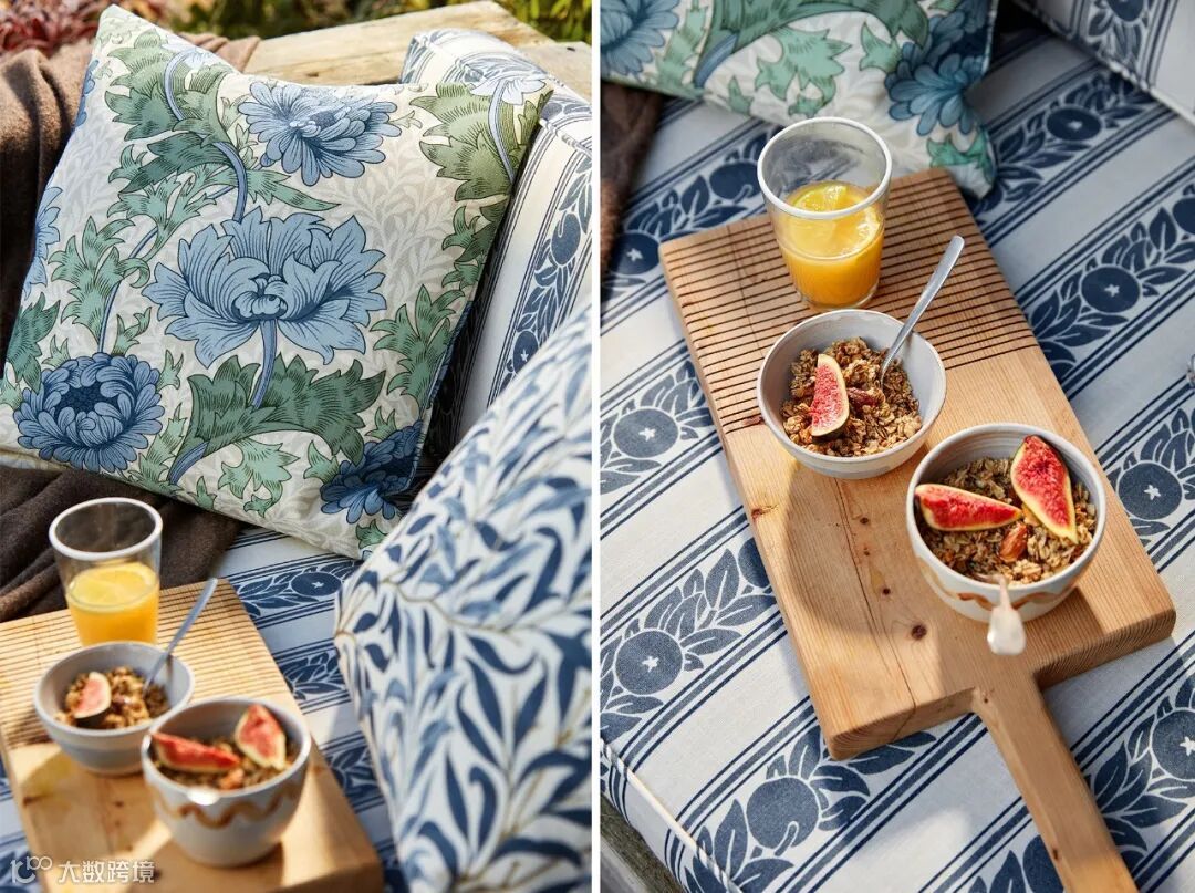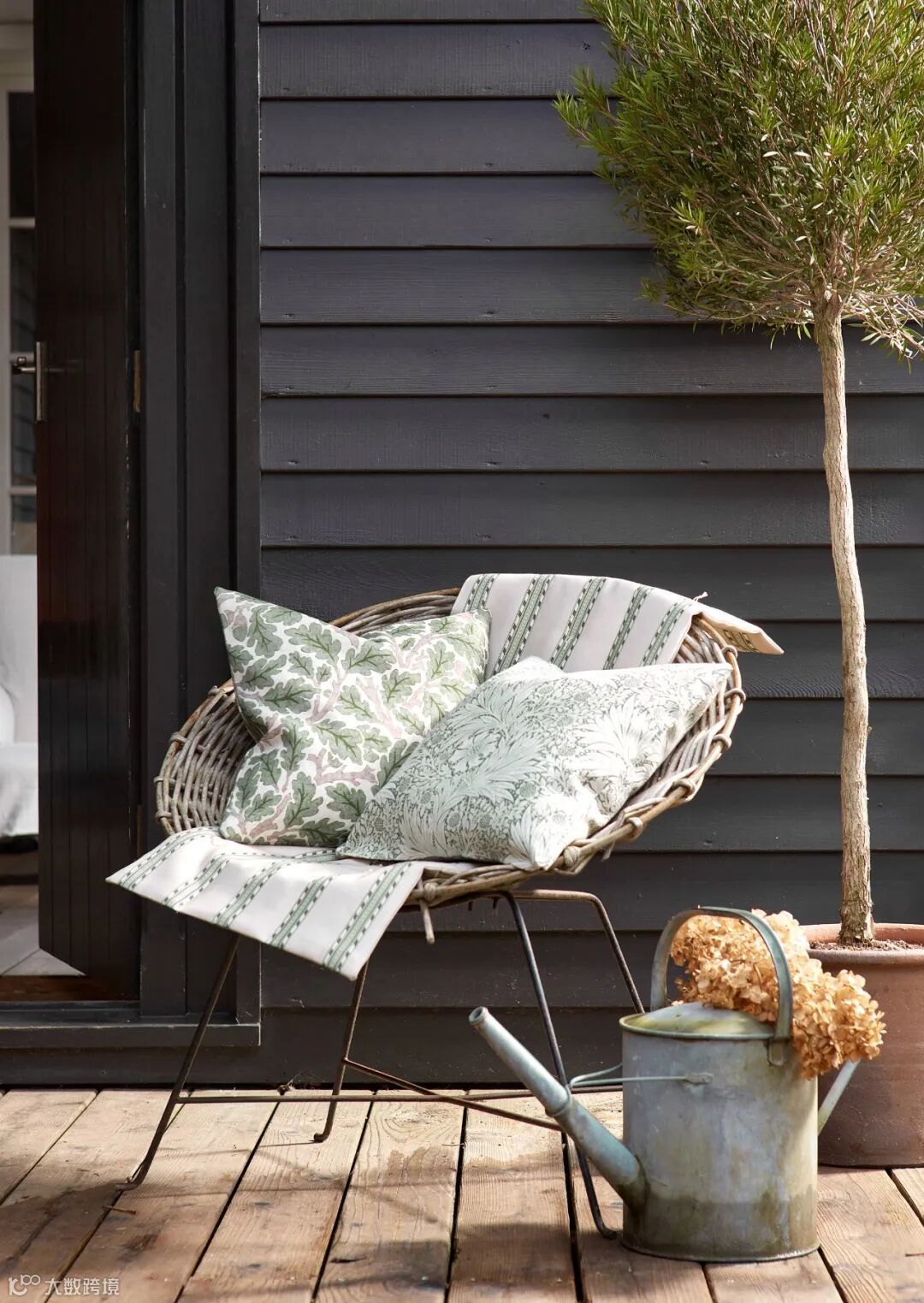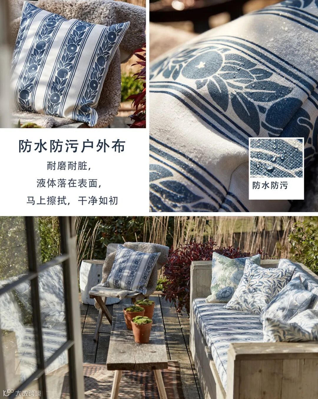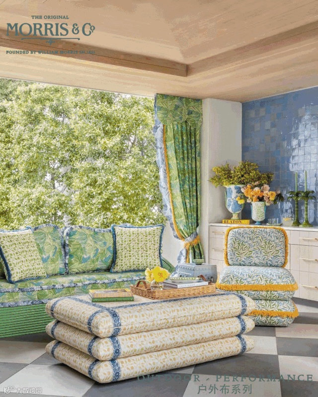 Morris&Co.新推出的户外布系列包含了25种经久耐用的面料,非常适合家庭中繁忙的活动区域、花园、露台和泳池边。我们英国工厂一支专门的制造商团队使用创新的材料和技术生产,确保室内和室外使用的耐用性。这些 特殊处理包括抗紫外线和防水性、可擦拭整理、抗微生物和不褪色性能,为您的面料应对日常生活的喧嚣做好准备。