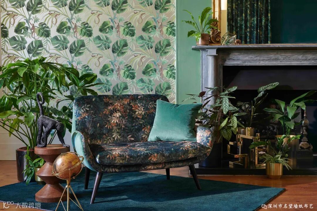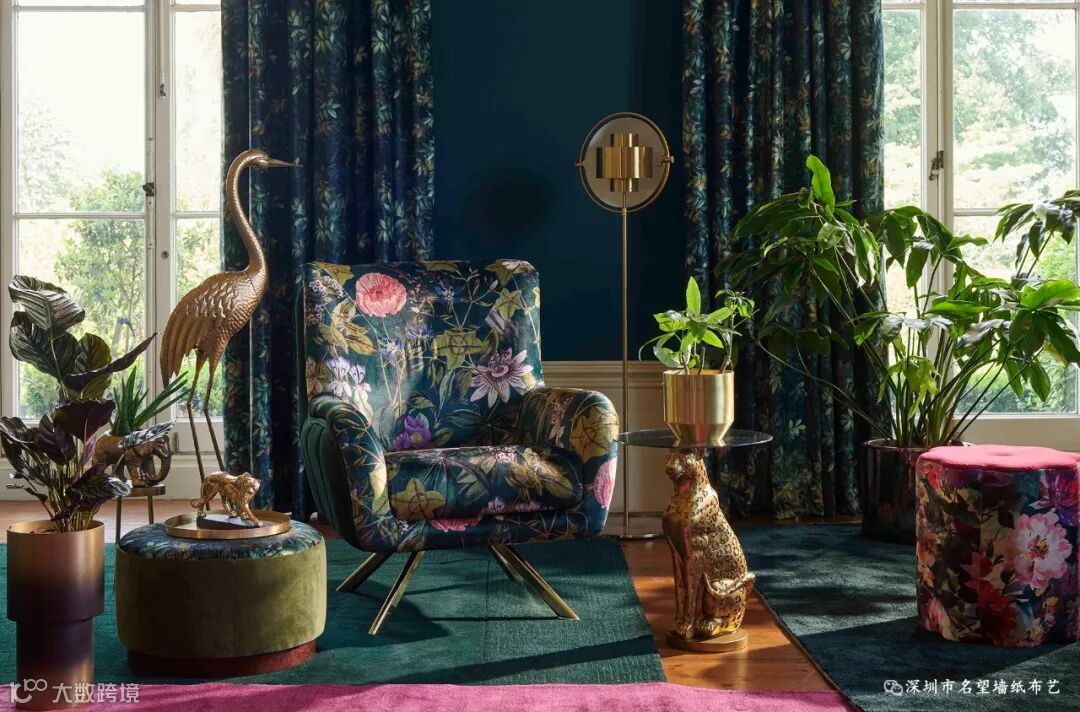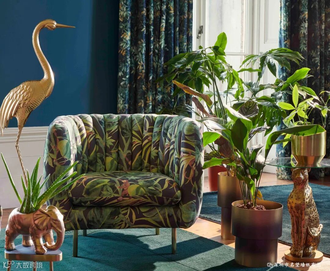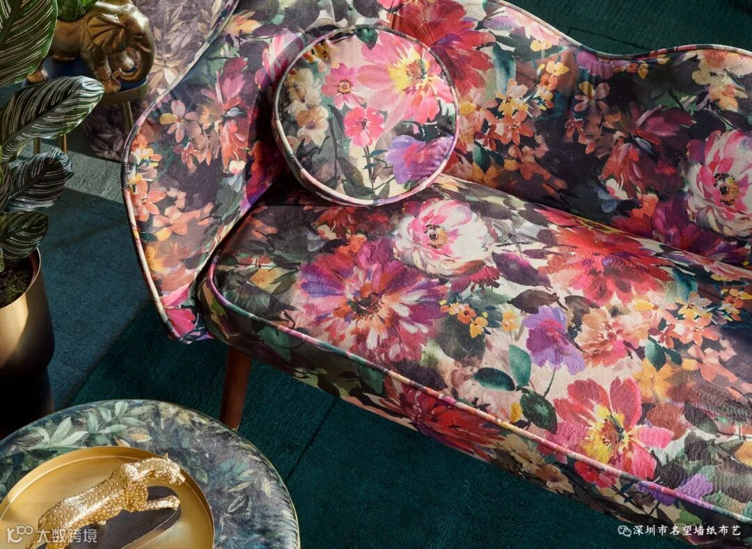 刚果以中部非洲的热带雨林命名,这款图案你能感觉到阳光穿透刚果雨林的苍穹,出来的画面具有浓郁的民族风情,有着独特的风韵魅力。它用深邃而富有戏剧性的颜色印在富丽堂皇的天鹅绒上。因为天鹅绒本身具有柔和的光泽和美丽的纹理,搭配油画效果的图案,复古中带着奢华,奢华中透露着颓废感,呈现出高级感。