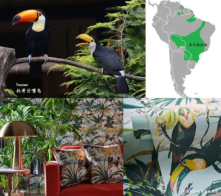 托哥巨嘴鸟——南美洲热带地区较常见的大鸟,尤其是作为亚马逊雨林的代表鸟种而为人熟知。托哥巨嘴鸟喜欢居住在半开放的栖息地中,例如林地、热带稀树雨林和其他具有分散林地的地方。至于为什么它们的颜色如此鲜艳,是因为在树林中的光线比较多变,鲜艳的颜色反而更加容易隐蔽自己。在热闹非凡的热带雨林中,它们也时常玩“果实接力”的游戏,也就是一只鸟抛起一颗坚硬的果实,在一旁的另一只鸟用大嘴在空中接住,之后,这只鸟又用大嘴把果实抛起,让下一位伙伴接住,以此类推,轮番而至。它们总是活得很潇洒快活,总是对人笑脸相迎的样子!用Toucan托哥巨嘴鸟系列装饰空间直接带我们去到热带地区,仿佛可以感受到亚马逊丛林明亮、沸腾的气息。用手工绘制出油画效果提炼自然界的森林元素呈现出热带欢乐的场景,深深吸引了人们对热带岛屿生活的关注。