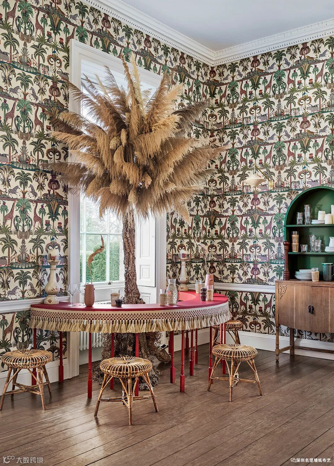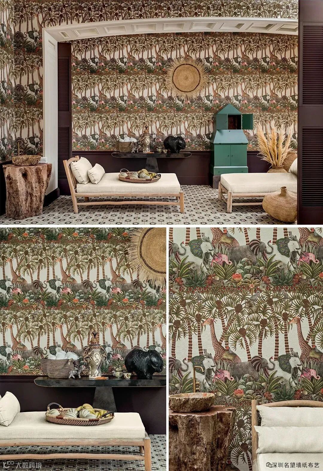 优美的曲线呈拱形缠绕,层层叠叠,在复杂的轨迹中重复。手工描绘的美洲豹、长颈鹿和大象以一种自然和谐的方式相互呼应,以喜庆的图案装饰庆祝着节日。