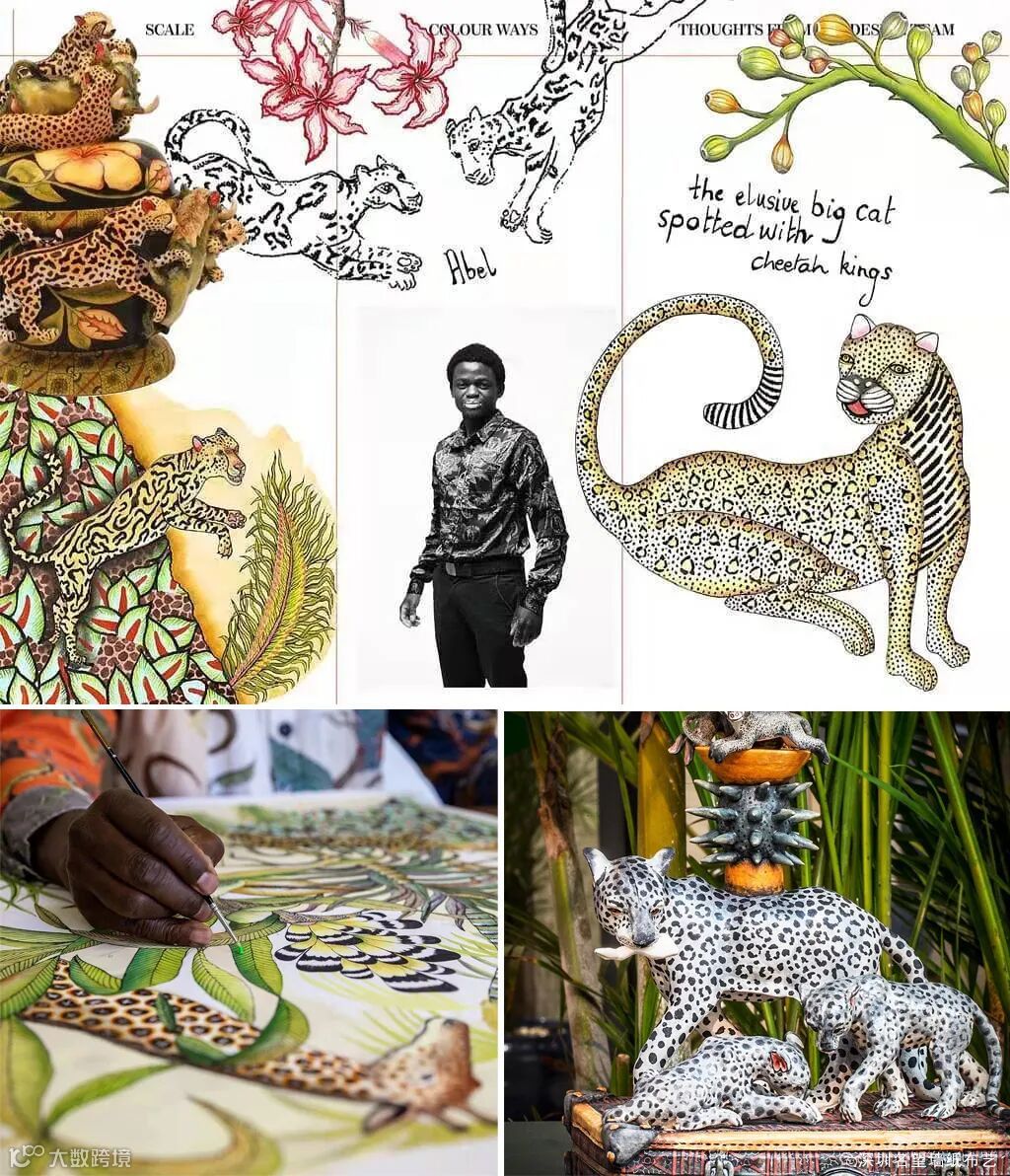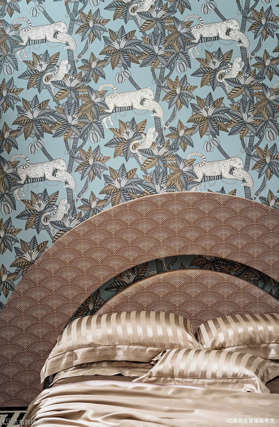 这种宁静的设计包括扇形叶子、弯曲的树干和藤蔓,所有这些都用精确的条纹和扇贝装饰。豹子的皮毛给人一种更加不驯服的感觉。色调上采用了黄褐色、柔软的金属金和青铜,还有一种幽灵般的云母光泽,就像出现在梦境中一样。