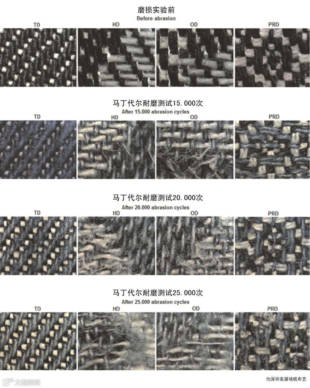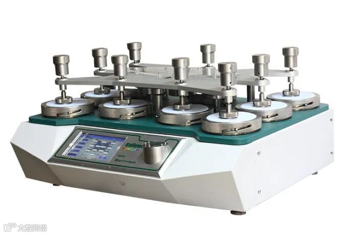 耐磨性能是布料产品质量的一个重要指标,直接影响产品的耐用性和使用效果。具体指织物间或其他物质在反复摩擦的过程中,抵抗磨损的特性。常用的国际标准是马丁代尔耐磨方法(ASTM D4966-98), 该方法测量摩擦试验(Martindale rub test)的循环次数作为测试的试验次数。每个测试一次进行500次循环,在标准布上摩擦测试,直到在机织织物中发现两个断线或在针织织物中发现有破损。并数下上次测试得到的数字,比如实验已经过了10,000圈,再过了500圈,发现有破损,但是后来重复试验发现有一次在10,000圈的时候出现了两根线被撕裂, 然后最终的计算结果按10,000圈算。
