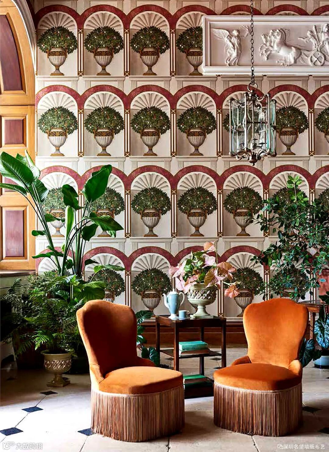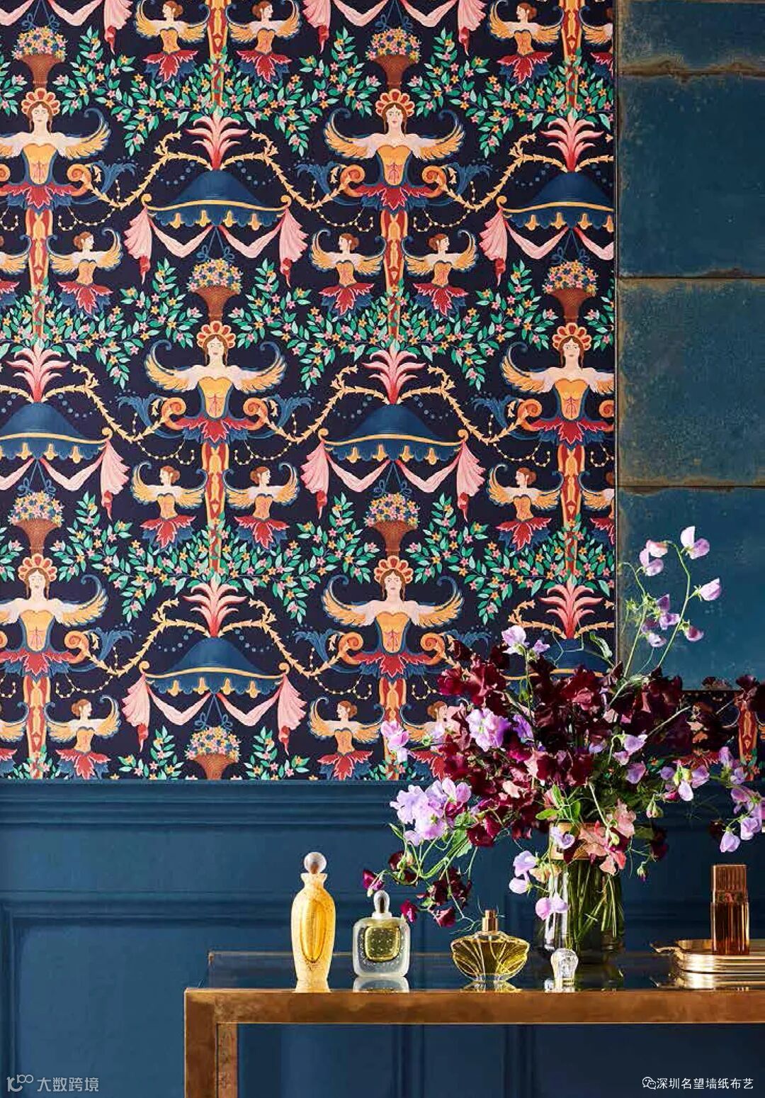 Cole&Son的设计师从展厅天花板上独特的旋转木马式结构中汲取灵感,这是肯辛顿宫国王国家公寓的一部分。最初由威廉·肯特(William Kent)设计,这是18世纪早期设计中最具影响力的名字之一,他设计的这个房间曾是国王招待和接待朝臣、大臣和外国大使的地方。舞蹈人物与精致的树叶和成熟的水果结合在一起,这些水果都是在肯辛顿宫的橘园里发现的,创造了一个装饰性的颓废派设计。