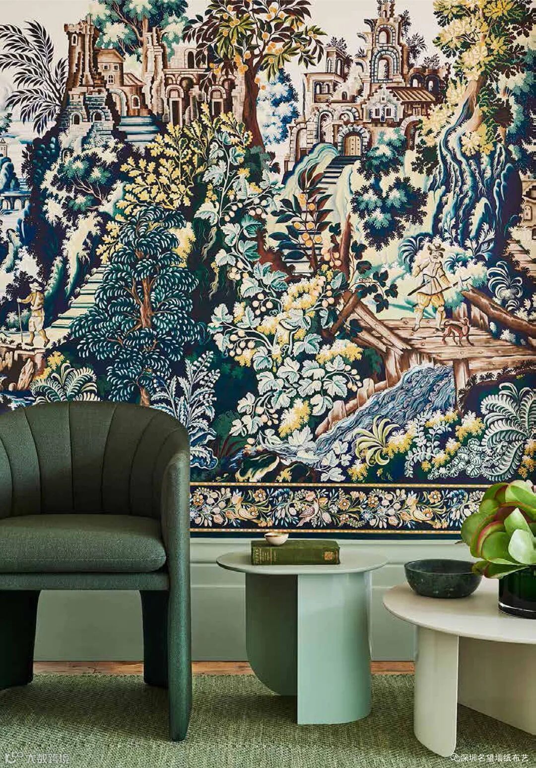 A luxurious and decadent alternative to anon-woven wallpaper, Verdure Tapestry Silk is a bespoke offering from thedesign house of Cole & Son. Utilising a 100% natural slub silk base, the design harks back to the rich silken wallcoverings used in the grandest royalre sidences around the world. Retaining the hand-painted, verdant scene ofVerdure Tapestry, this bespoke wallcovering is an ode to the master artisanswho created the original 17th century woven frescoes. Its palette isreminiscent of these beautifully aged tapestries which are still displayed within the King’s Presence Chamber of Kensington Palace, with its natural baseensuring that every panel is distinctly unique. Designed to perfectly fit aninterior, this bespoke design can be tailored to any space, from an opulentpowder room to a masterful drawing room. Combining exceptional quality with superior artistic heritage, Verdure Tapestry Silk is a rare jewel within the Great Masters crown.