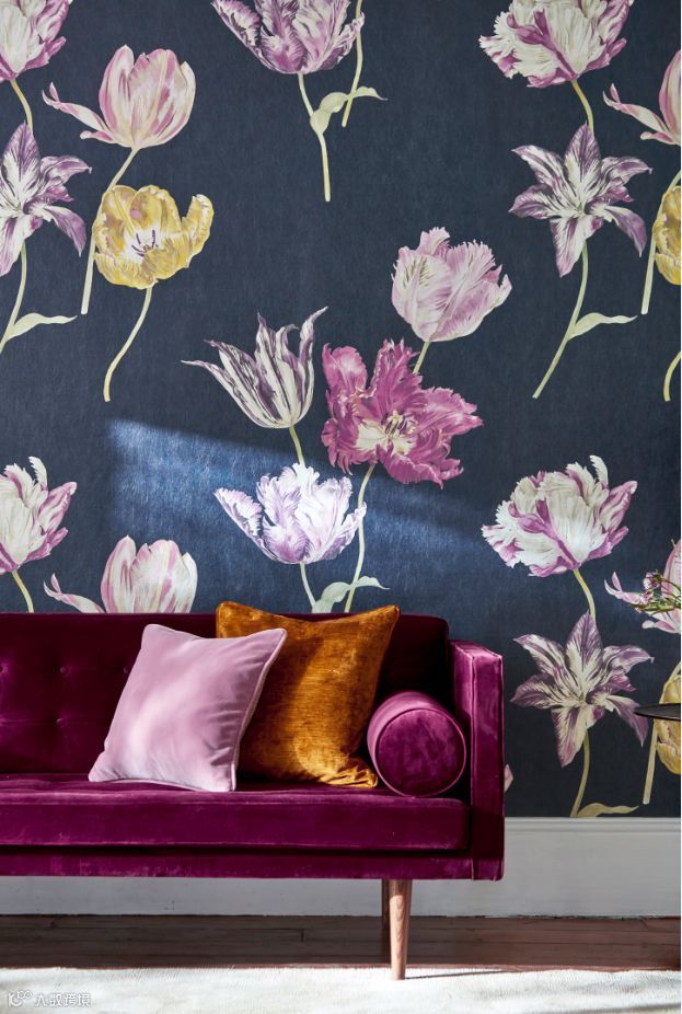 郁金香狂热与它干净的白色或者深蓝色背影形成鲜明对比。