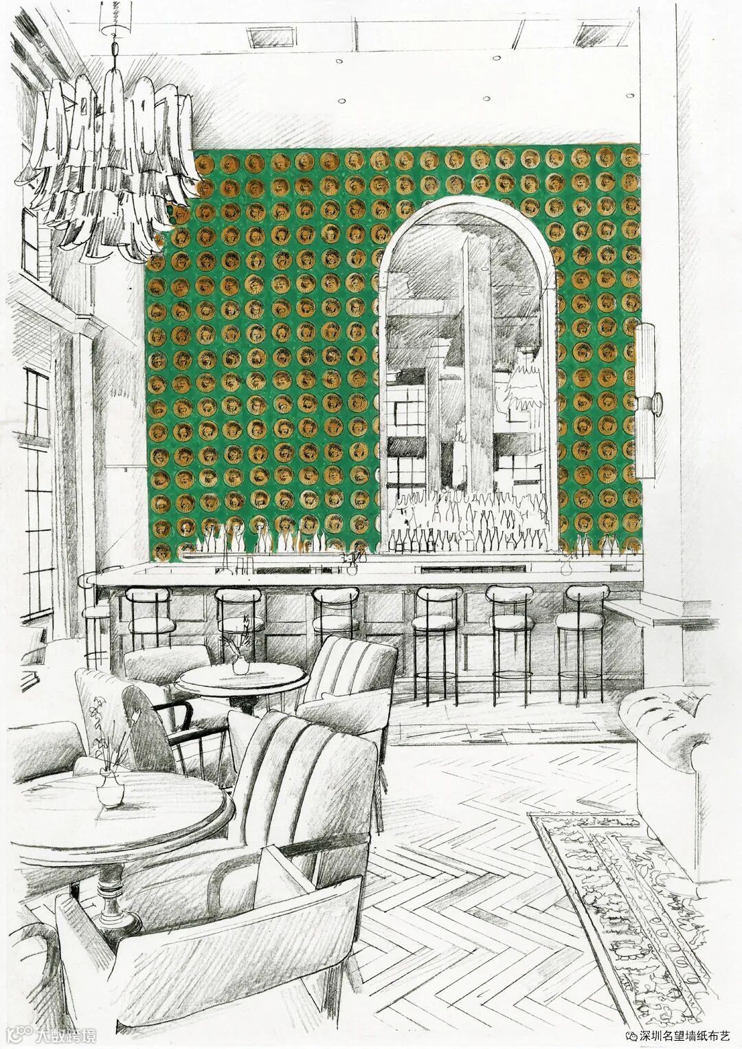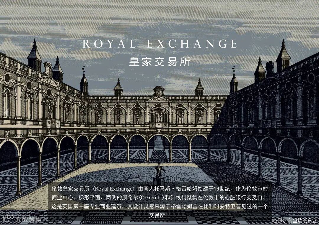 非常的大气和华丽,这款墙纸显示了戏剧性和标志性场景。设计1965年由罗伯特·尼科尔森(RobertNicholson)创作,最初是水平悬挂款,1644年著名的伦敦皇家交易所温塞斯劳斯-荷兰雕刻版启发了这一设计。加上闪闪发光的金色配色代表着交易广场的财富。