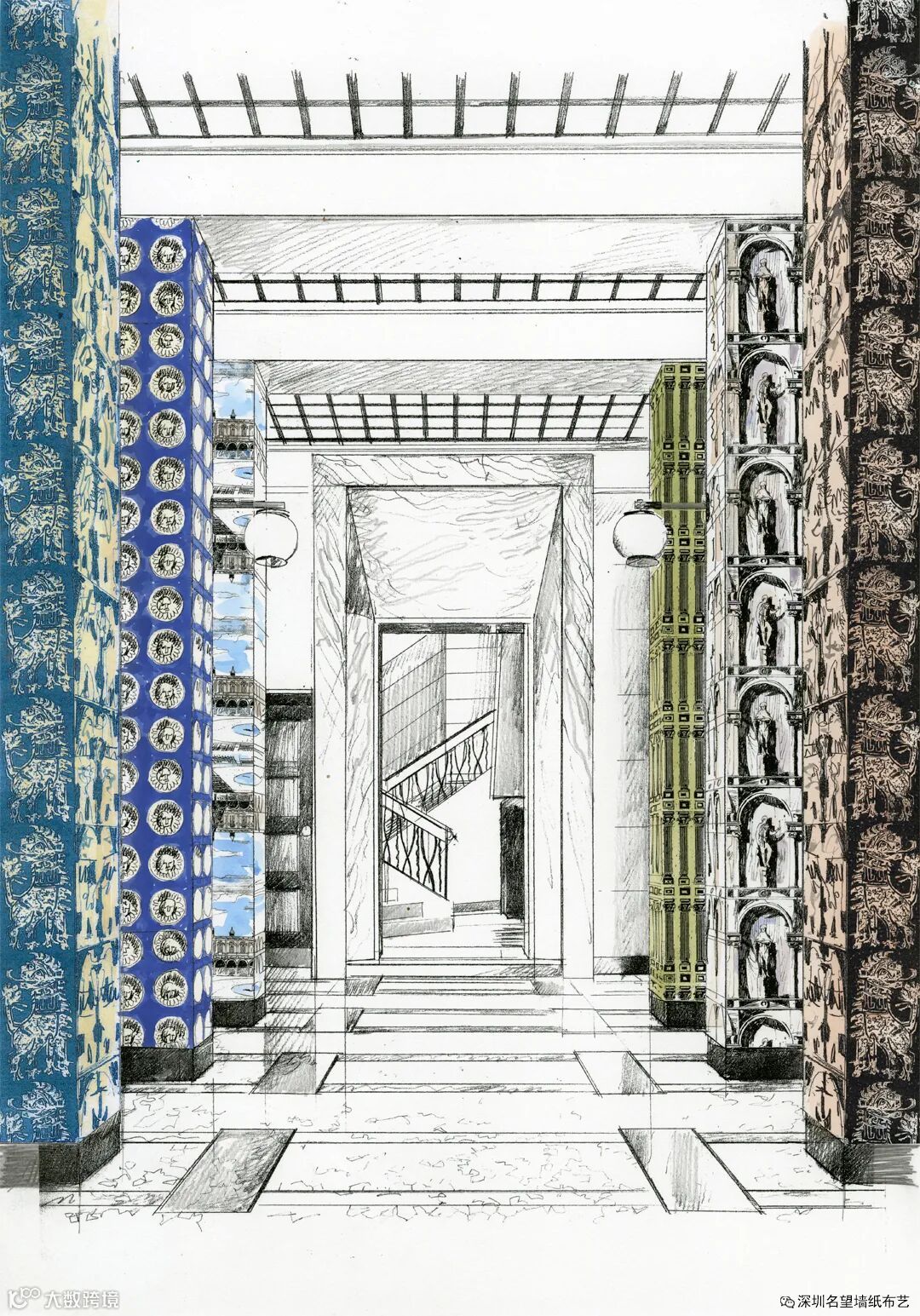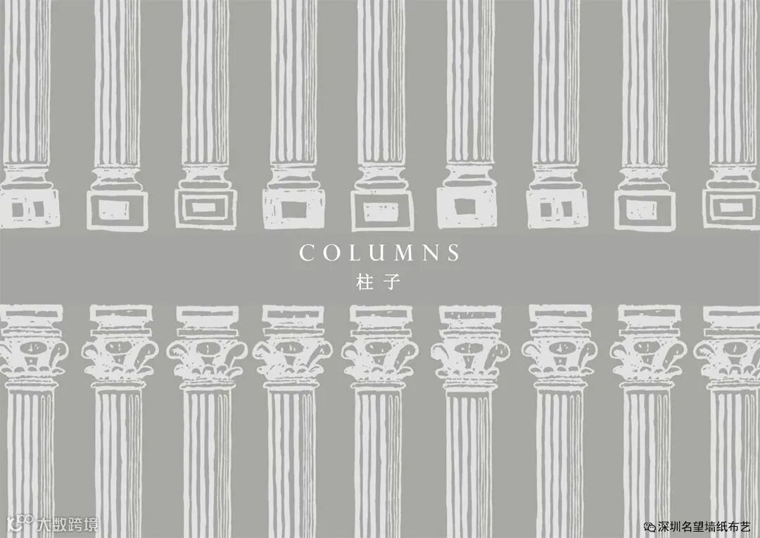 灵感来自于古典建筑——1956年Robert Nicholas设计的高耸重复排列的科林斯风格的柱子图案,智能和精心构思的结构,它被重新用金属油墨和当代色彩塑造,看着有明快和现代的感觉。
