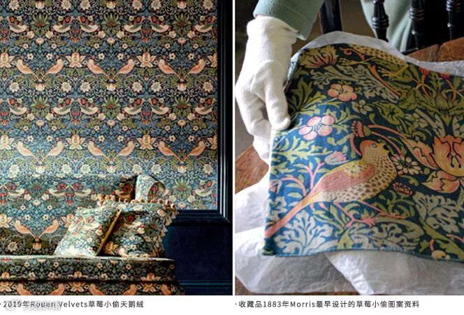 草莓小偷是Morris & Co.公司最具标志性的设计之一。Rouen Velvets系列这种天鹅绒布料的诠释保留了原作同样迷人的细节,仿佛可以看到在花园里迷人、大胆和美丽的偷吃草莓的画眉。