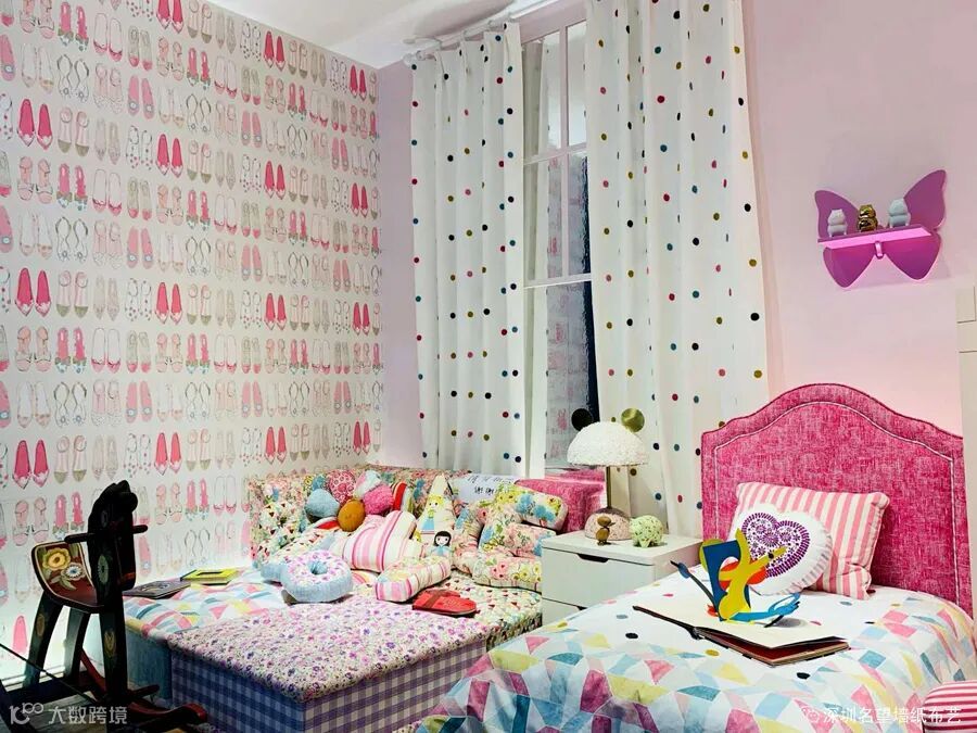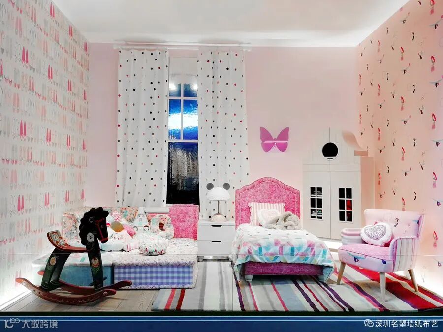 波点的窗帘、粉色的墙面、可爱的蝴蝶挂壁、摇晃的木马等构成了这个可爱又充满童趣的儿童房。