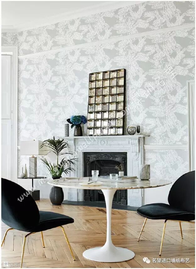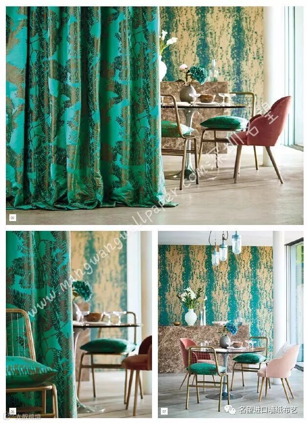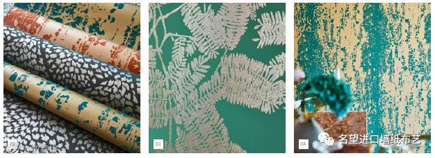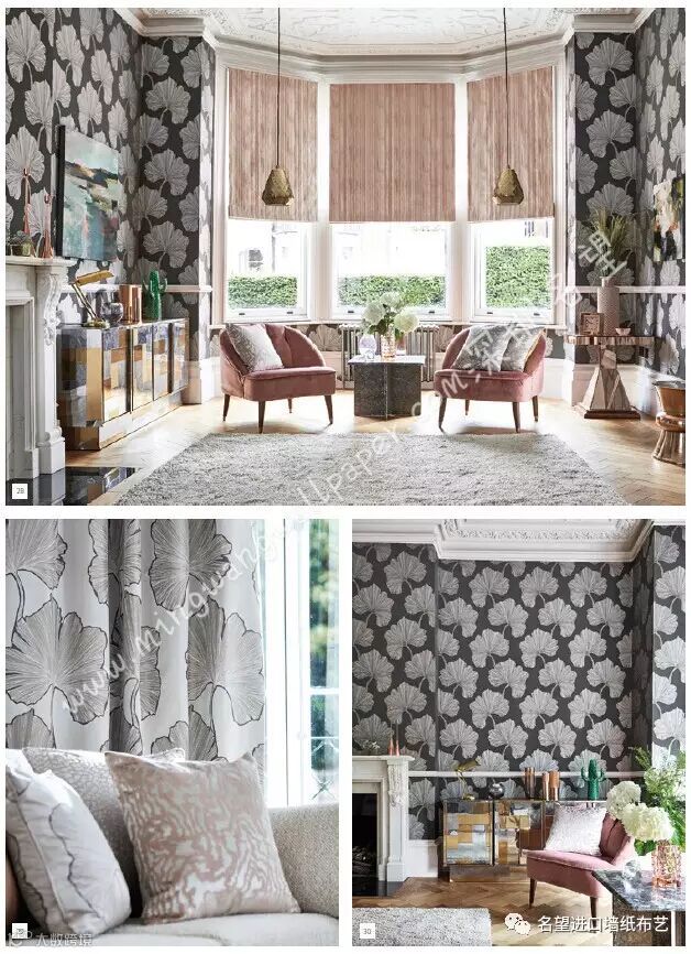 在这些图案中,既有活泼的银杏叶和蕨类植物剪影,也有重复展示的马赛克拼贴图案、交错的装饰艺术风格扇形图案、粉刷纹理效果条纹、复古风格的镜子和保持华美气质的古老锦缎。