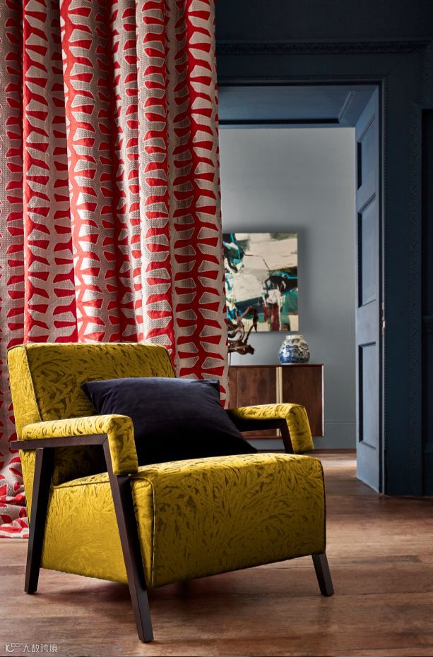 Verdi Applique这个原创设计创造于Zoffany工作室,在色彩丰富的100%亚麻底料上呈现抽象的图案。绣上的丝绒贴花打造出精致的细节及反射光的性质。