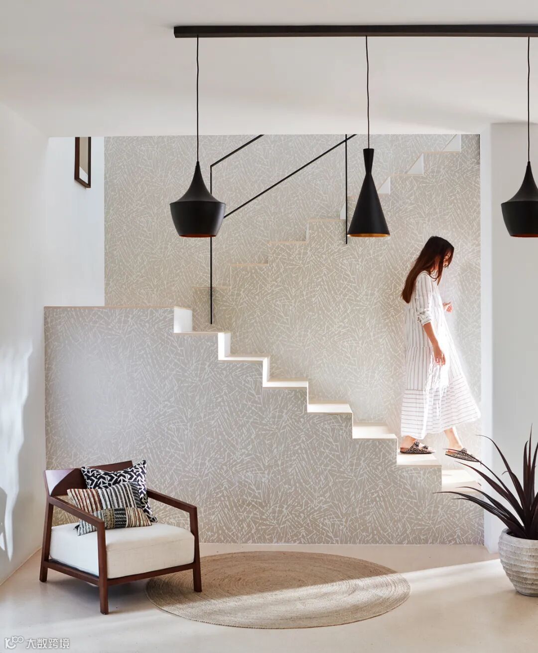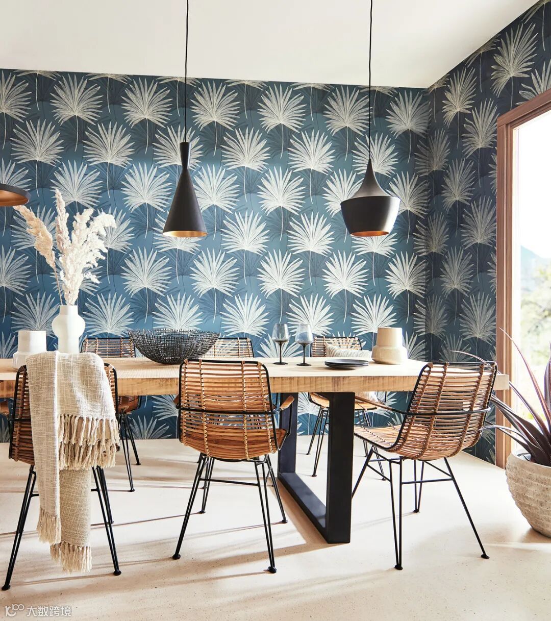 透过被太阳晒透的棕榈叶,你可以看到破碎的、轮廓分明的光碎片在柔和的、金属色的背景上分层出现。在整个空间也可以使用这种过渡设计或单独创建一个优雅的功能墙。