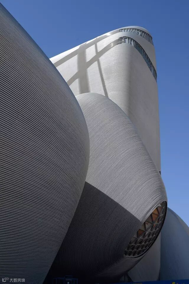 整个建筑的表皮被不锈钢管包裹,形状扭曲