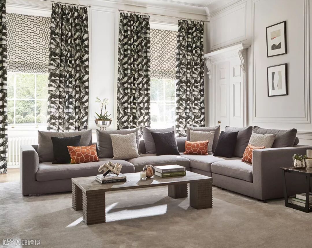 客厅背景墙以白色为主色调,窗帘和遮光布局部点缀黑灰的图案,时髦复古脏橘色软垫的加入,跳跃的视觉点缀为空间注入轻奢,时尚的气息。通过色彩的配比,独特的图案,整个空间气质徒然上升,一进门就被深深吸引。
