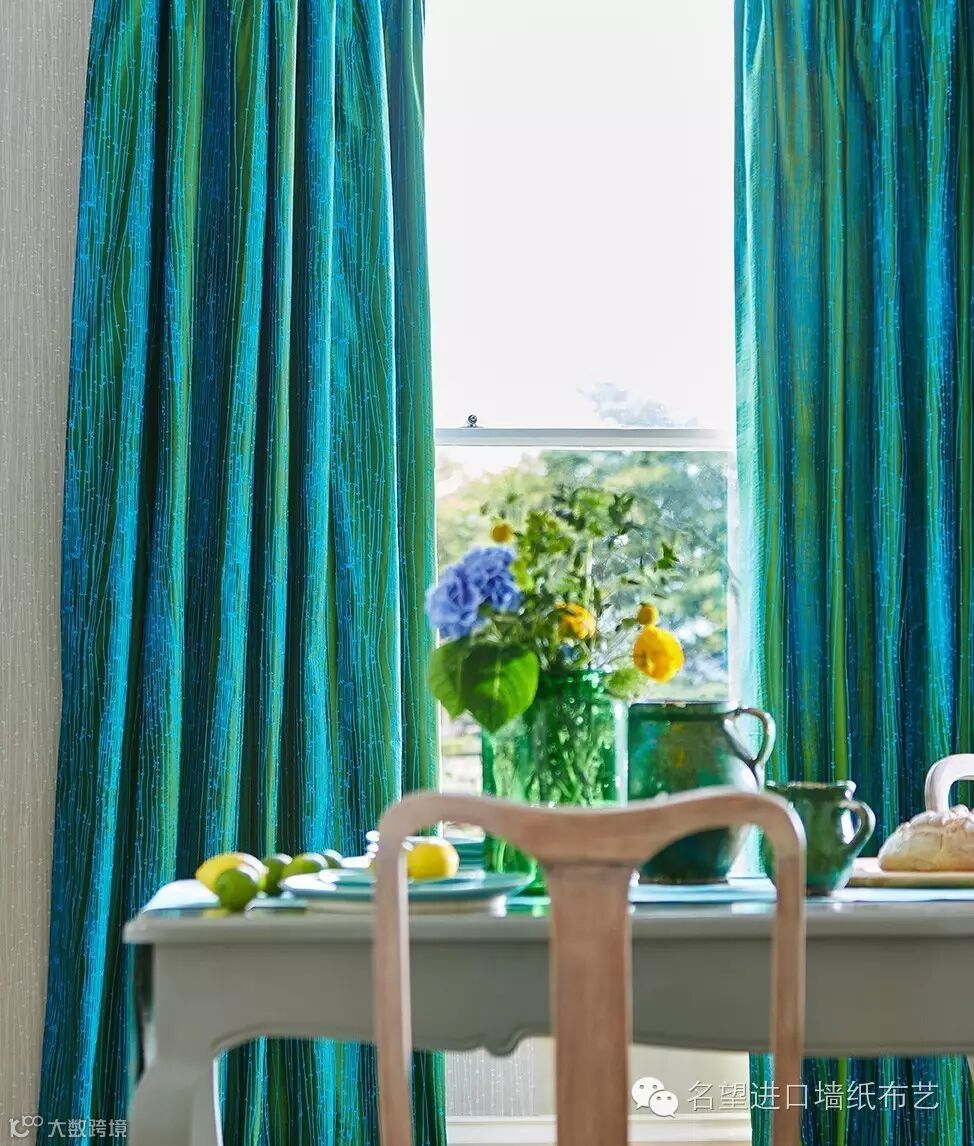 牧场草浪-层叠摇曳的牧场青草,灵感源自维尔特郡(Wiltshire)。她以英国和希腊的地平线为灵感,以大胆张扬的水彩线条予以全是,呈现出别致的哈莫尼亚条纹(Harmonia Stripe)效果。背景色彩由浅入深,缀以大量的花朵轮廓,微妙而细腻。