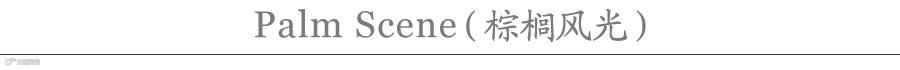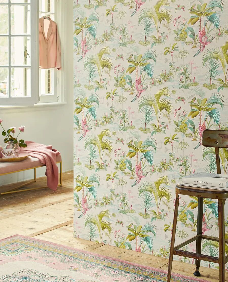 “Palm Scene(棕榈风光)”设计展示了天堂鸟、棕榈树和树叶以及异国情调的花朵。这幅以山和水为背景的热带场景,给人一种复古的感觉。