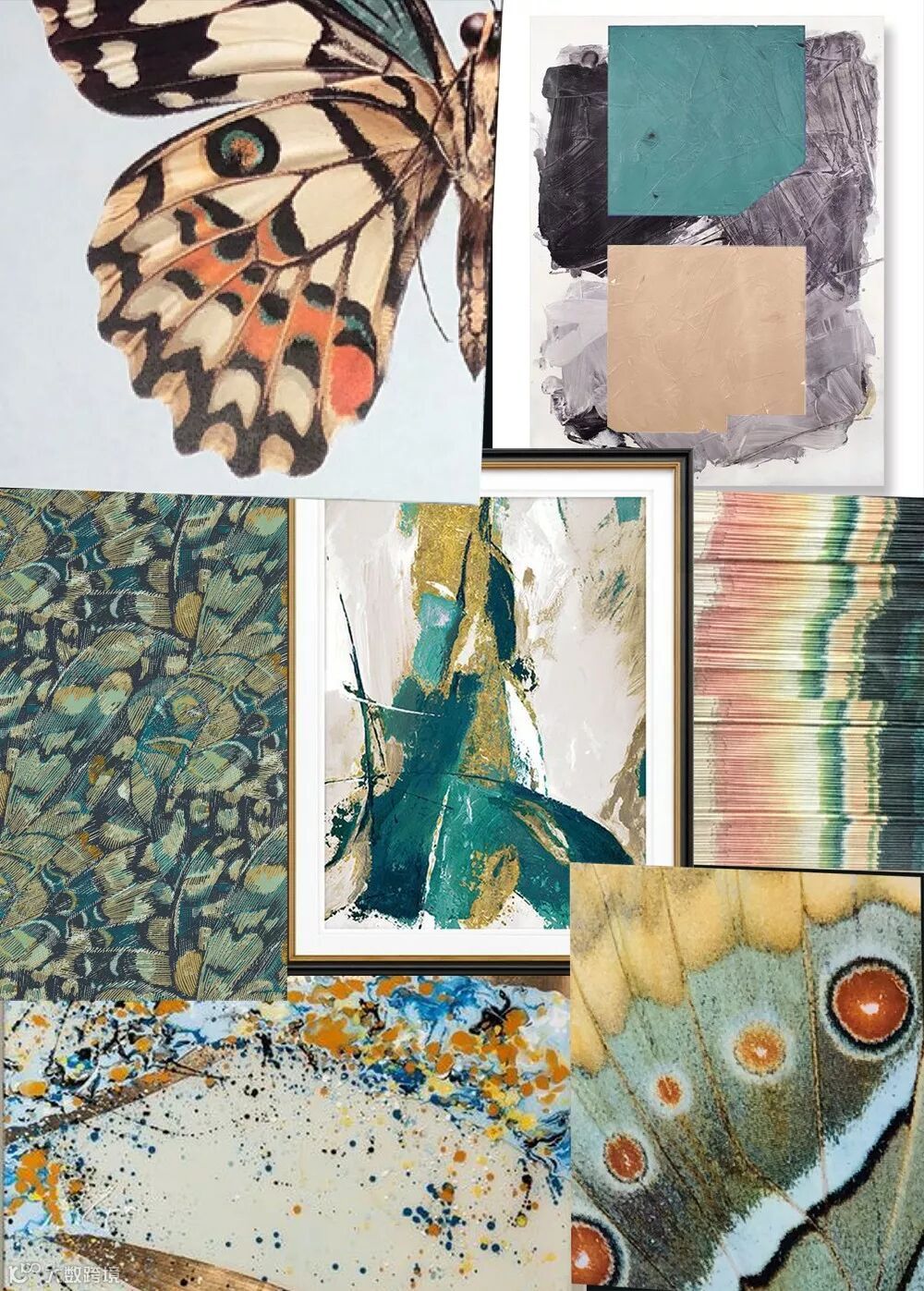 充满魅力的蝴蝶翅膀,色彩底色以棕色和黑色等暗色为主,而表层颜色较为丰富,以亮色为主。丰富多彩的图案造型,展现出蝴蝶的灵动和优美感,融于微弱的渐变色彩效果,更有视觉美感和韵律感。