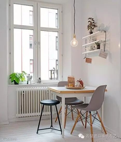 小户型最难解决的就是餐厅如何摆放不占地?!可以在厨房隔出一小块儿区域,椅子不用时可随意搬动。