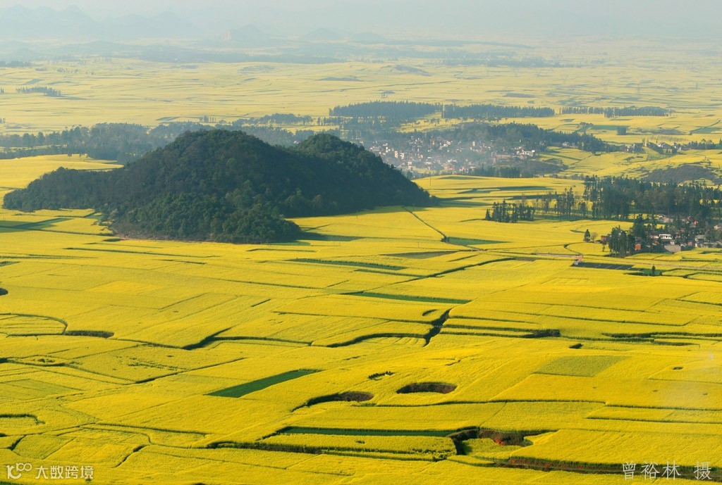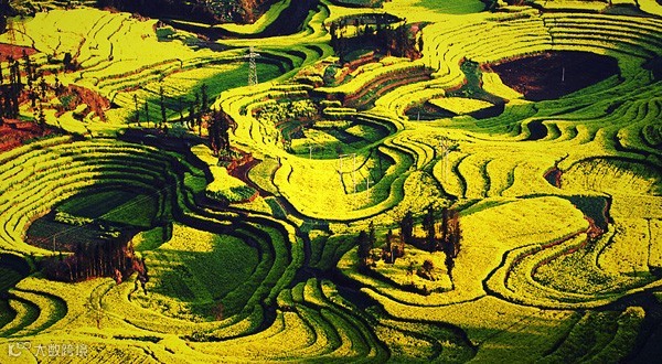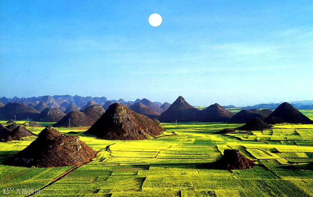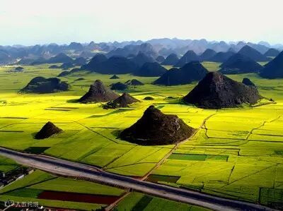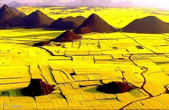 油菜花海里,村落点点,寨子棋布;此起彼伏的喀斯特锥形山,点缀花海中,有如人间仙景,构成绝妙的画图。罗平被誉为“世界最大的自然天成花园”。