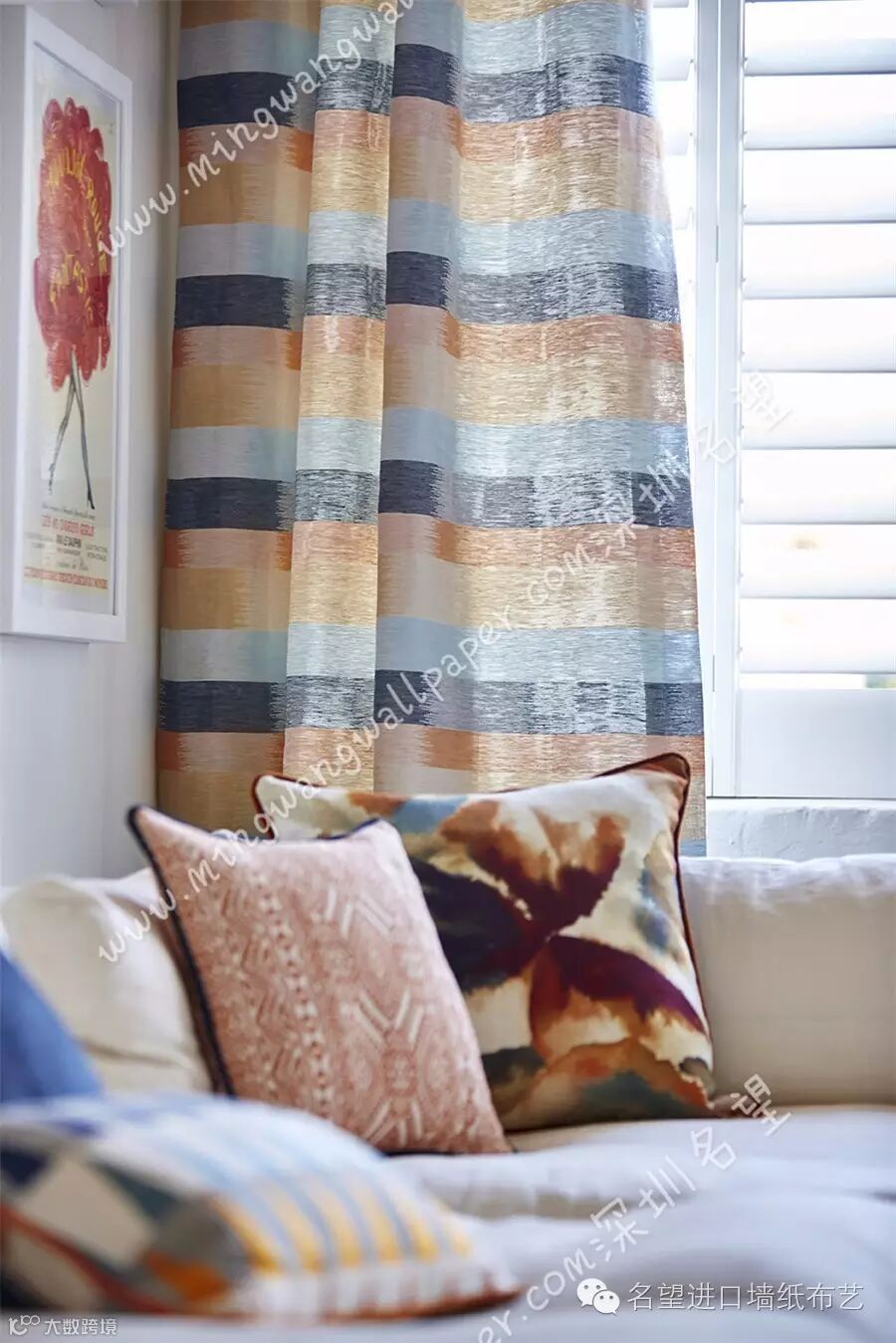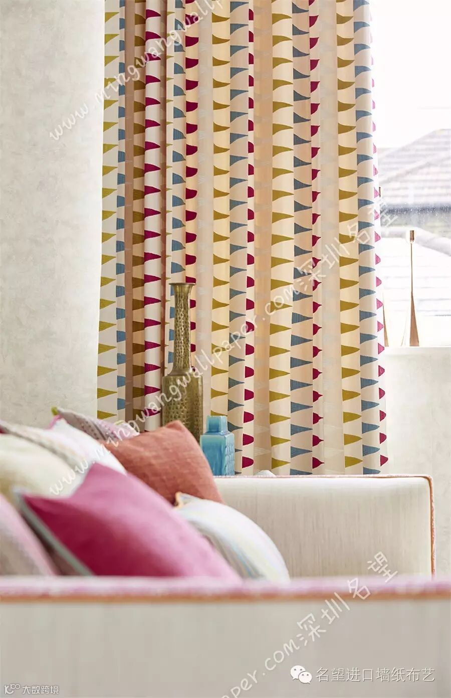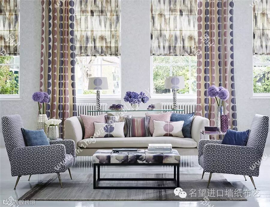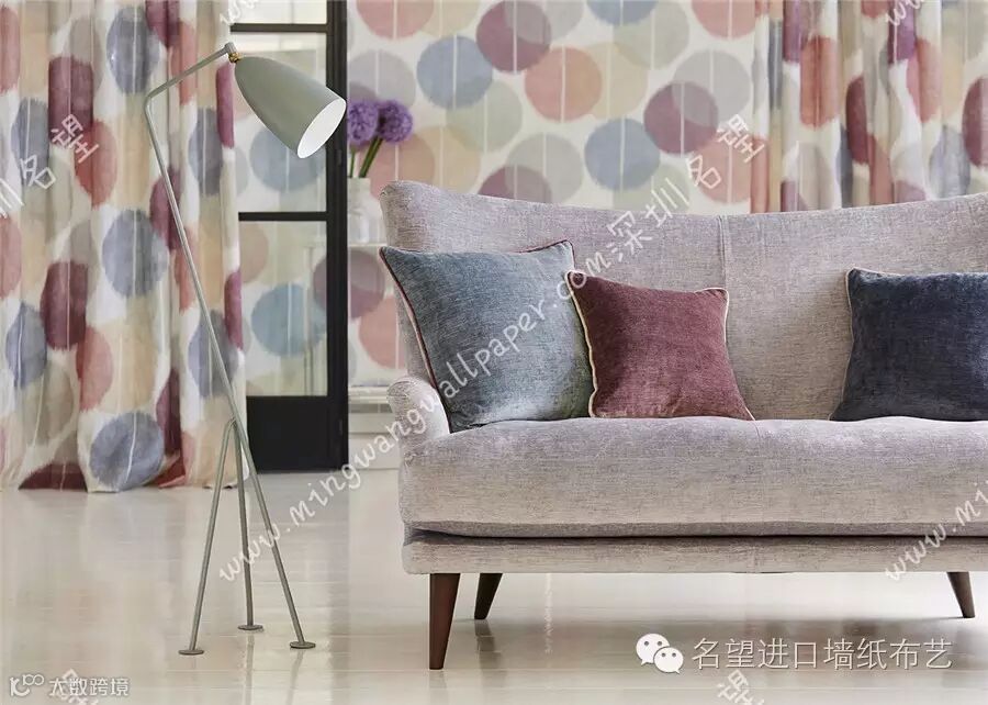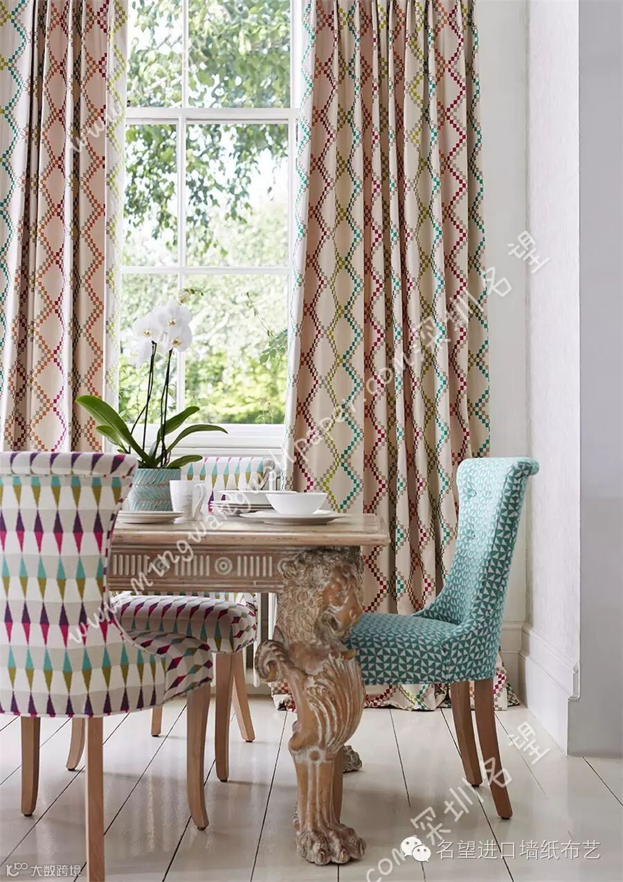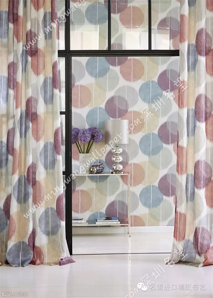 这些窗帘面料包括三种数码印花图案:一款伊卡特半透明薄纱、一款梭织提花布和四款绣花布。该系列的印花图案包括:相互交叠、有伊卡特饰边的圆盘,傲然怒放的抽象水彩花朵,以及一个棱状条纹。这些图案彼此交错,形成了一种精致微妙的光影和色彩效果,再搭配光面印花棉布,更有锦上添花之效。提花布的图形设计以断断续续、甚至是像素化的线条和绣花为主,包括亮丽夺目、色彩丰富的锯齿窄纹,用三角形拼成的条纹和马赛克方格式图案。