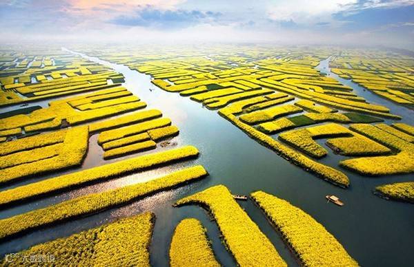 跟罗平、婺源的油菜花田不同,兴化的油菜花田虽然也有壮美的大片金黄,但却是开在水中,一块块垛田散布在广阔的湖面上,乘着小船泛舟水上,就像穿梭在金色的花海之中,绝对是不一样的赏花体验