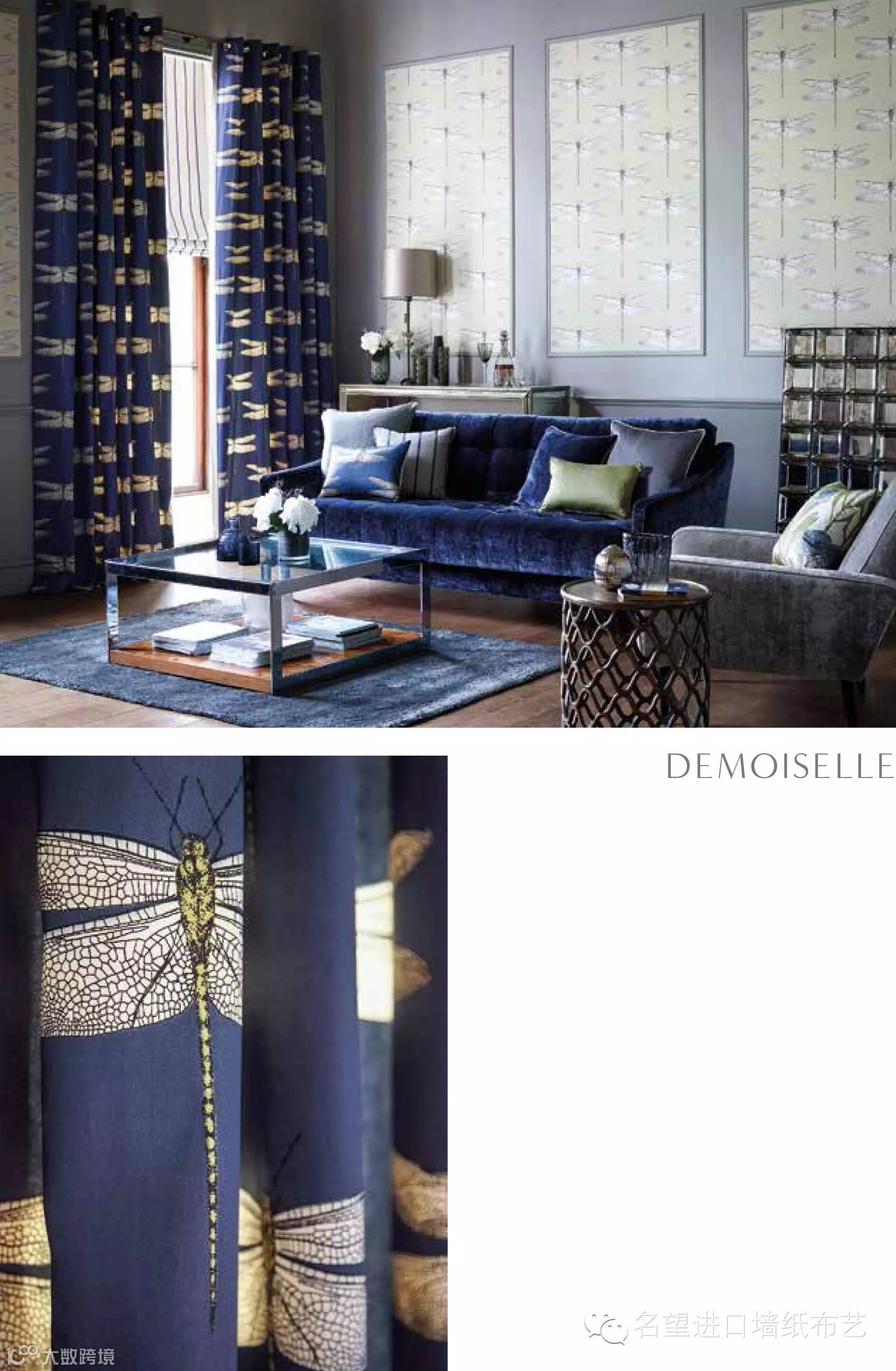 整个系列的设计灵感起源于一本植物手册。手册中对橡胶植物和西番莲花进行了独特地描绘,这诱发了设计师对橘园的憧憬。六种精美的印花同时呈现在一块由华丽的丝绸和天然亚麻制成,多种织线,锡箔和金属加以装饰的布料上。布料上布满了琳琅满目的蚀刻花朵,如,山龙眼以及精美如画的蝴蝶,蜻蜓和鸵鸟羽毛。不同于以往一成不变的白云,树叶,羽毛的直线印花设计,六种印花的其中的几个主题体现于多达 8 种壁纸中,增强了壁纸的金属质感和灵动感(例如,优雅飞行的白鹤印花设计)。