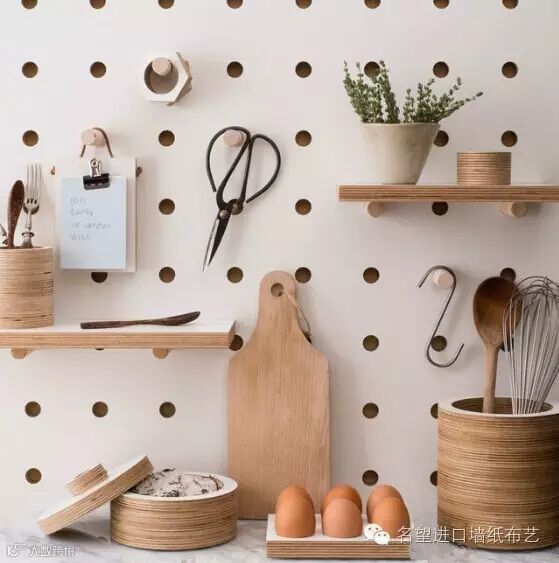 在墙上钉置一个搁物板,小木棍可随时变化孔位,方便实用,而且又很文艺范儿