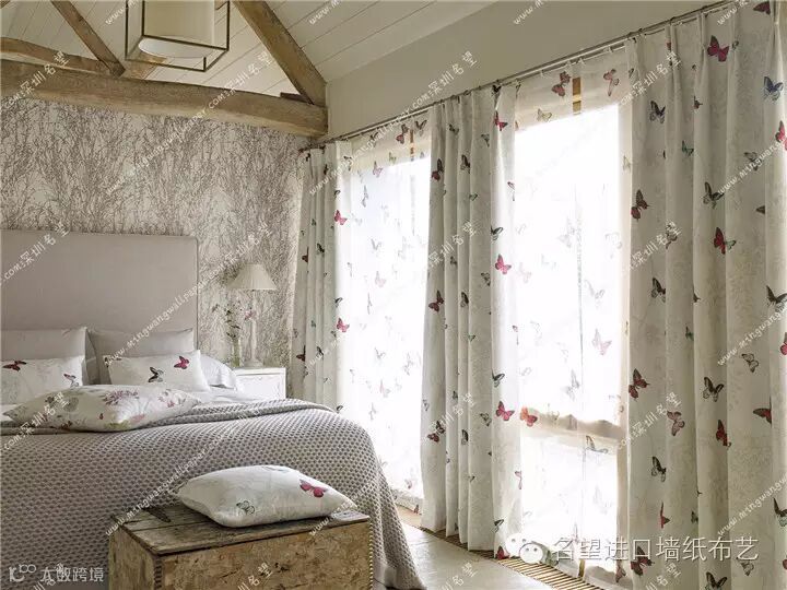 细腻精美的刺绣,现代而富有格调的蝴蝶图案,底布为洋溢自然气息的亚麻混纺面料,适合在现代乡村风格房间中用作窗帘。