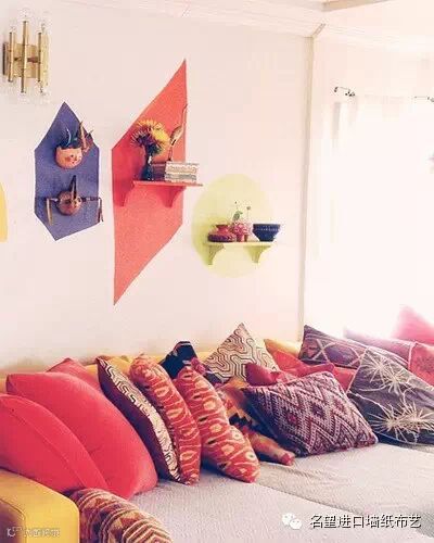 → 纯色的墙壁总显得空落落,如果在墙面上固定几个装饰杂物架,搭配跳脱艳丽的几何色块为底,马上就能焕发生机又充满实用性。