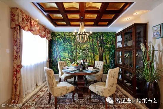 碎花布艺、盆栽、木饰面天花板相生相和,呈现出淡淡的典雅与浪漫。与之餐厅背景墙上的风景油画色彩饱满、主题鲜明,田园气息便油然而生。