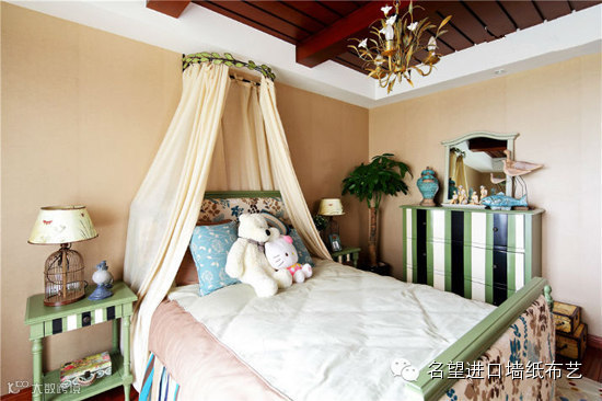 淡粉的墙面,碎花、盆栽恰到好处地点缀,大自然的气息令纯净质朴的空间充满温馨浪漫的幸福感。公仔的融入更显童趣可爱,给孩子茁壮成长的氛围。