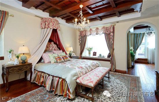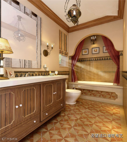 卫生间墙面浅红墙砖和地面的大理石菱形拼贴,彰显出空间的华贵与气派;浴缸上的曲线拱门,述说着欧式格调的优雅迷人。