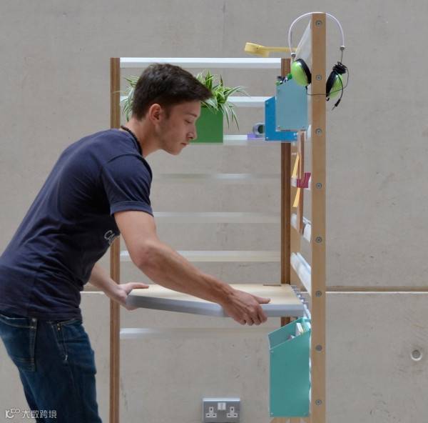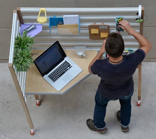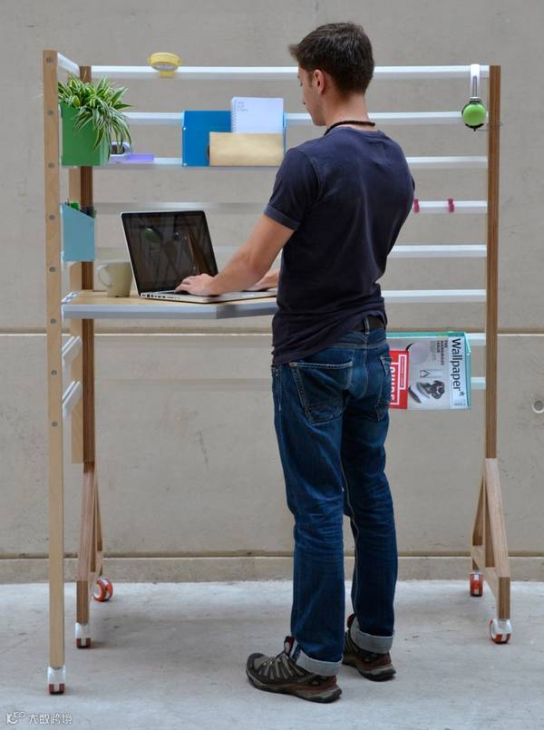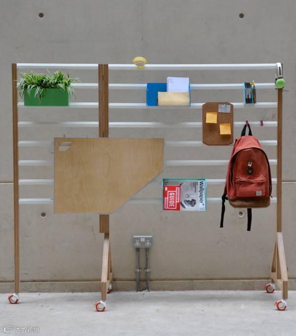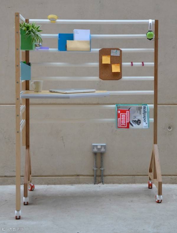 设计师David Manning设计的一个可折叠式的工作台一定程度上解决了小空间里的办公需求,它装了轮组可以任意移动。工作时其可以变成一张小型办公桌,闲置时也可以垂直平放成一个多层的悬物架。