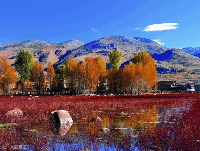 9月,镶嵌在林芝田地里的青稞都被浸染成了金黄色,当清风扫过,金色的海洋翻涌。此时漫步在巴松措湖边,仿佛置身于斑斓的彩林,隔岸望去,皑皑雪山就矗立在天边。蓝天、白雪、彩林、湖泊在眼前交相辉映。