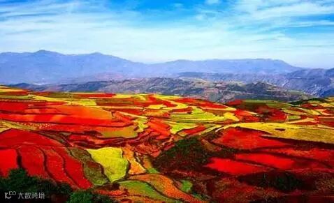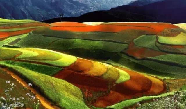 火红的泥土、变色的植物,各异的形状、优美的线条,衬以蓝天、白云和那变幻莫测的光线,东川红土地就是一副绚烂的变色油画!尤其是每年9月,这方土地点缀着各种成熟的作物,五彩斑斓,若再笼罩上一层薄薄的雾气,更是仙境一般。