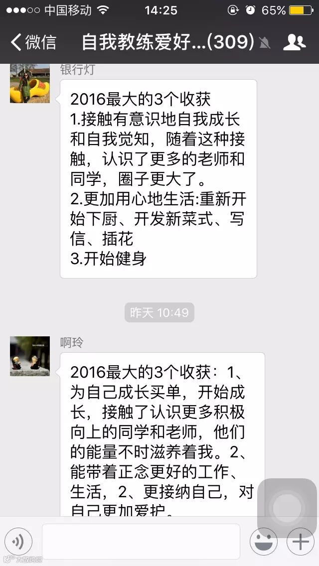 @田园土鸡:今年最大的三个收获:1.自我教练群进来后,內心更加强大了。2.更多考虑孩子们的內心感受,引导她们正确的做人做事。3.更细心体贴丈照顾先生的生活。