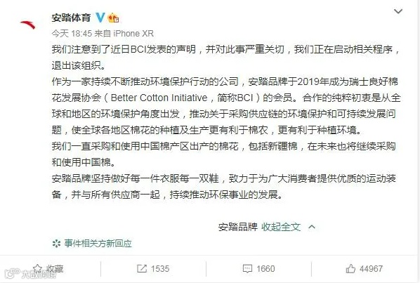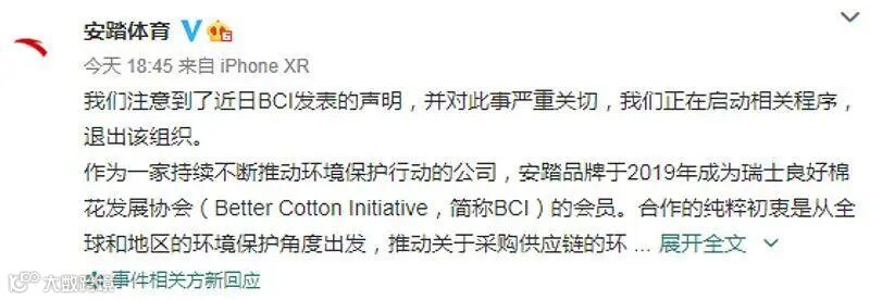 3月24日晚间,安踏官方微博@安踏体育发表声明称,注意到了近日BCI发表的声明,并对此事严重关切,正在启动相关程序,退出该组织。